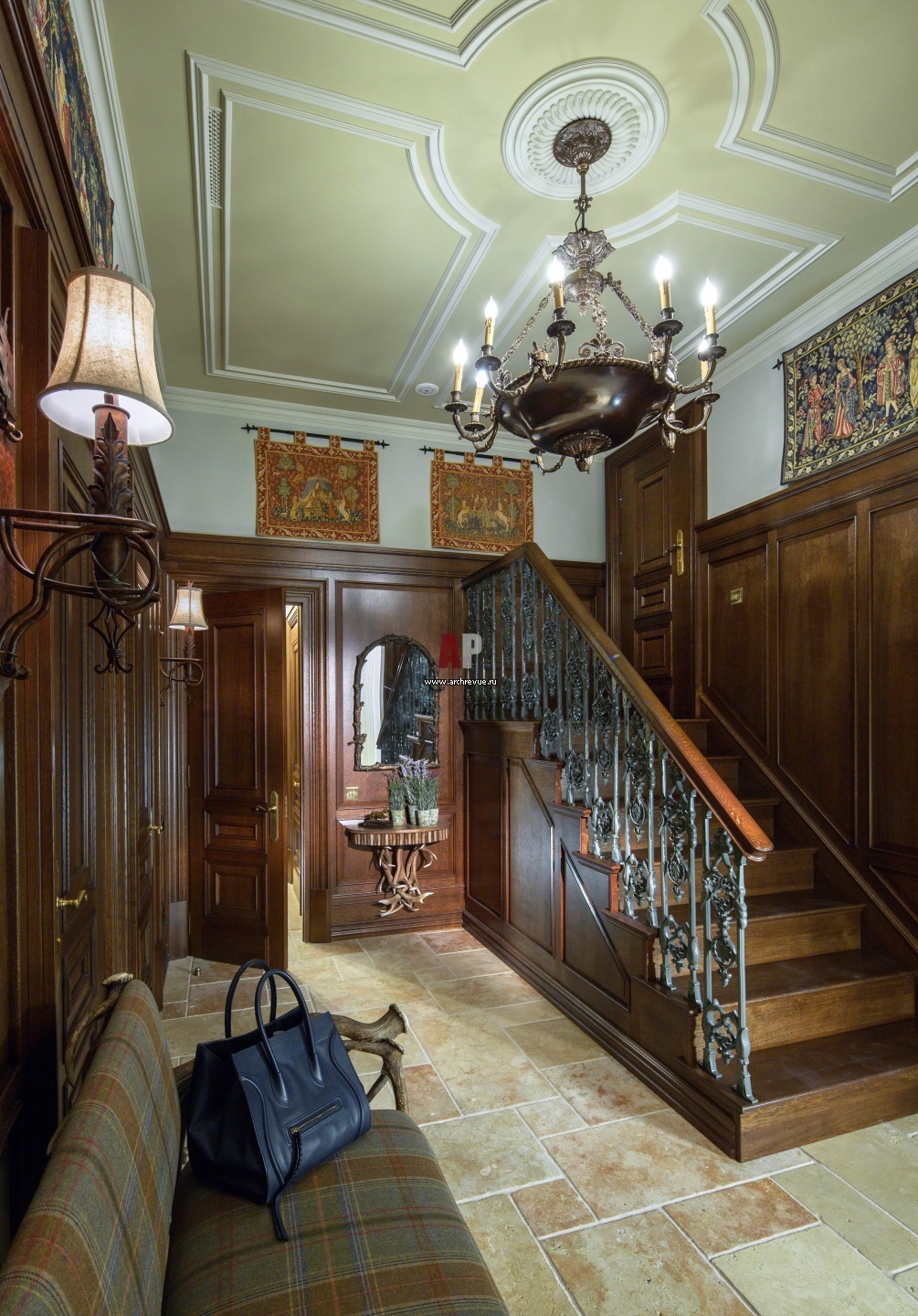 Английский дом в центре Санкт-Петербурга. Входная группа исполнена в духе английского замка. Стены зашиты панелями из темного дуба, из такого же дерева выполнены ступени лестницы. Ограждение – литой чугун. Под потолком размещены гобелены. На полу – травертин.