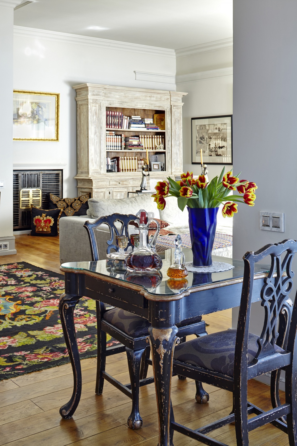 Вид со стороны чайного столика на диванную группу. Состаренная мебель придает интерьеру уют.
