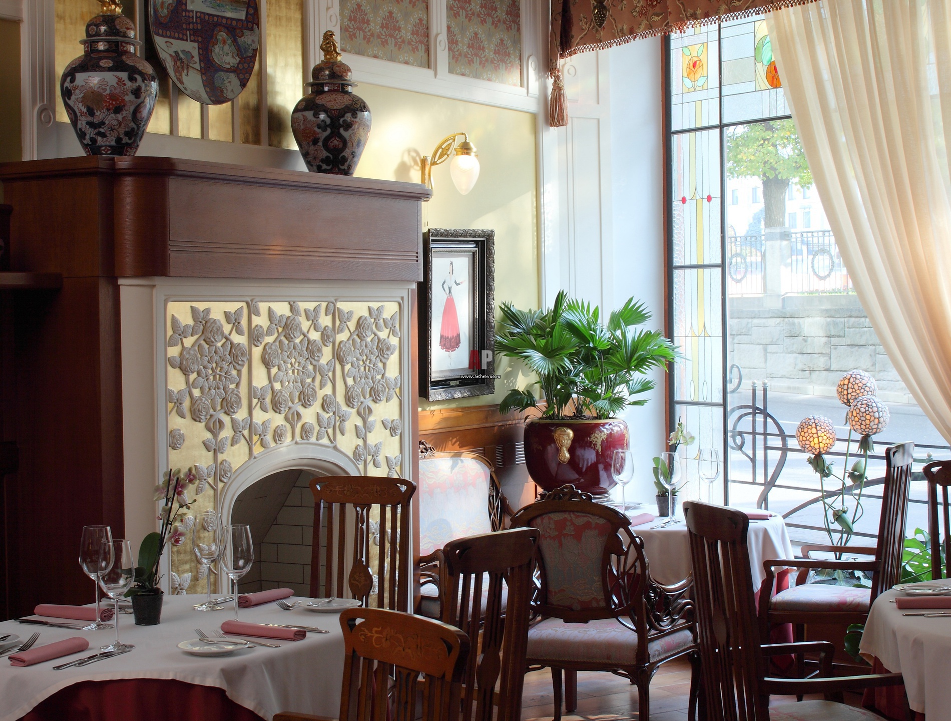 Зал ресторана. Возле витражного окна – камин. Его портал выполнен из дерева и украшен лепным растительным декором с позолотой.