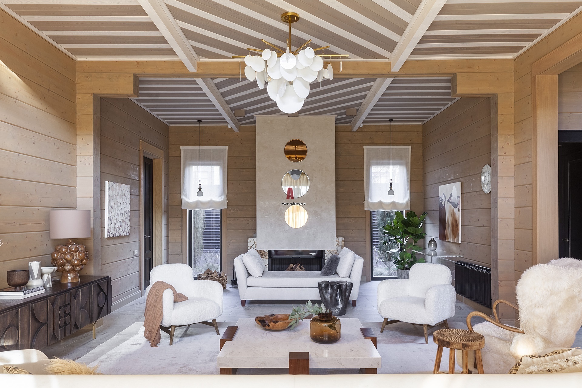Фото интерьера гостиной деревянного дома в стиле фьюжн