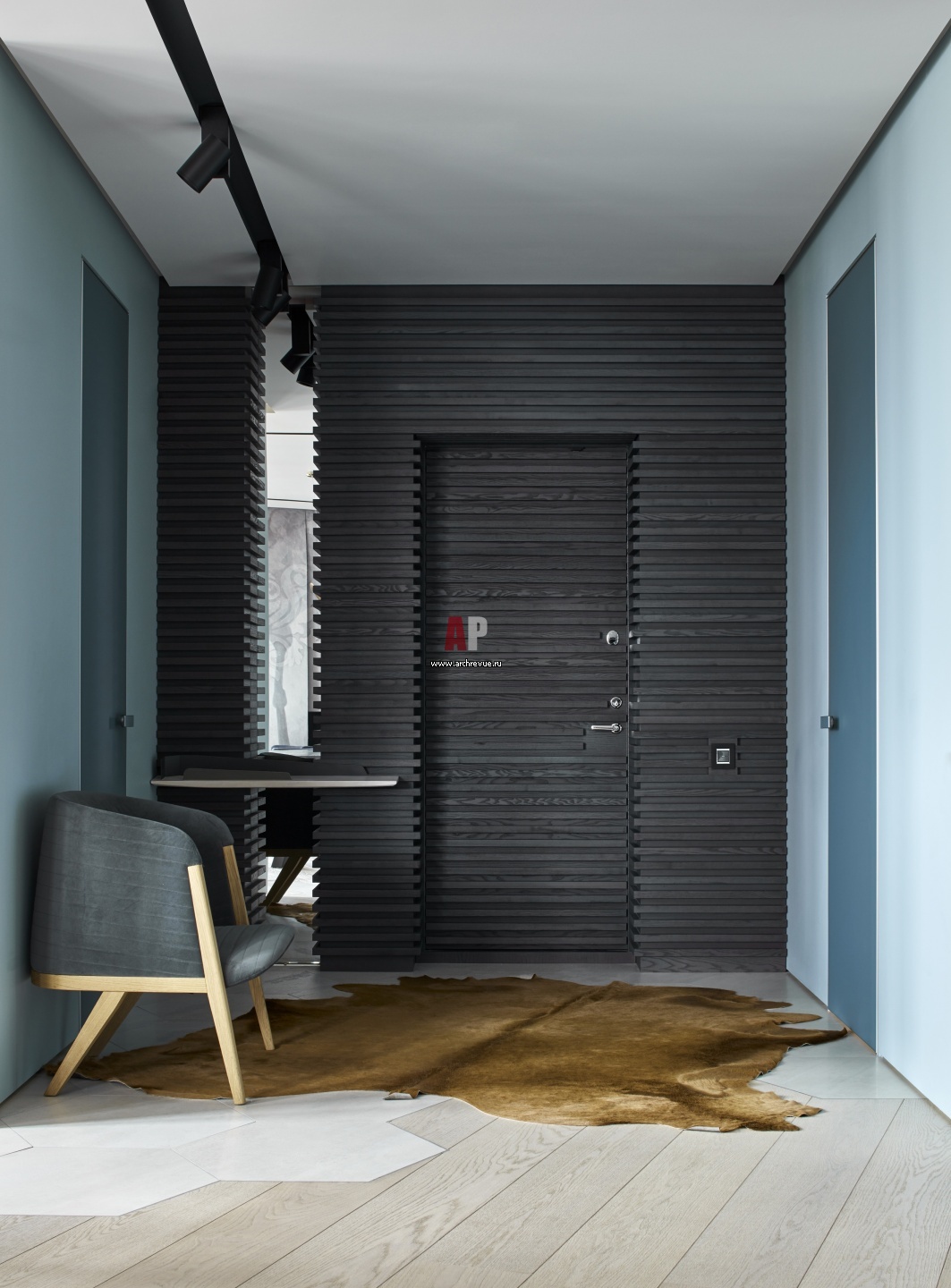 Небольшая прихожая объединена гостиной. Одна стена и входная дверь отделаны темной реечной конструкцией из массива дерева. На полу – плитка Apavisa в виде крупноформатных многогранников. Кресло, Moroso. Шкура, Ligne Roset.