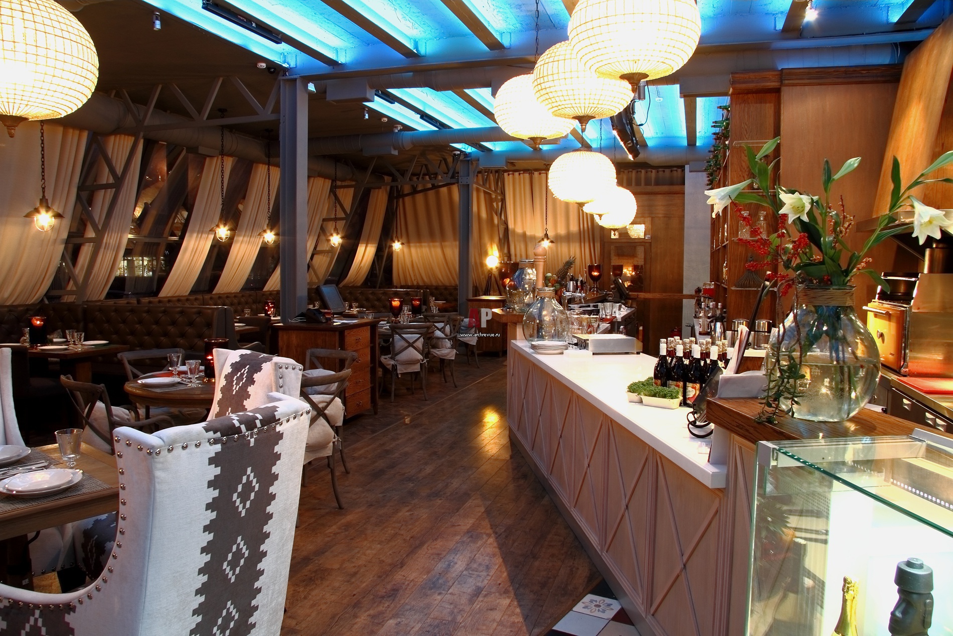 За стойкой, зашитой светлым деревом, находится открытая печь. Оно видна из любой точки зала ресторана.