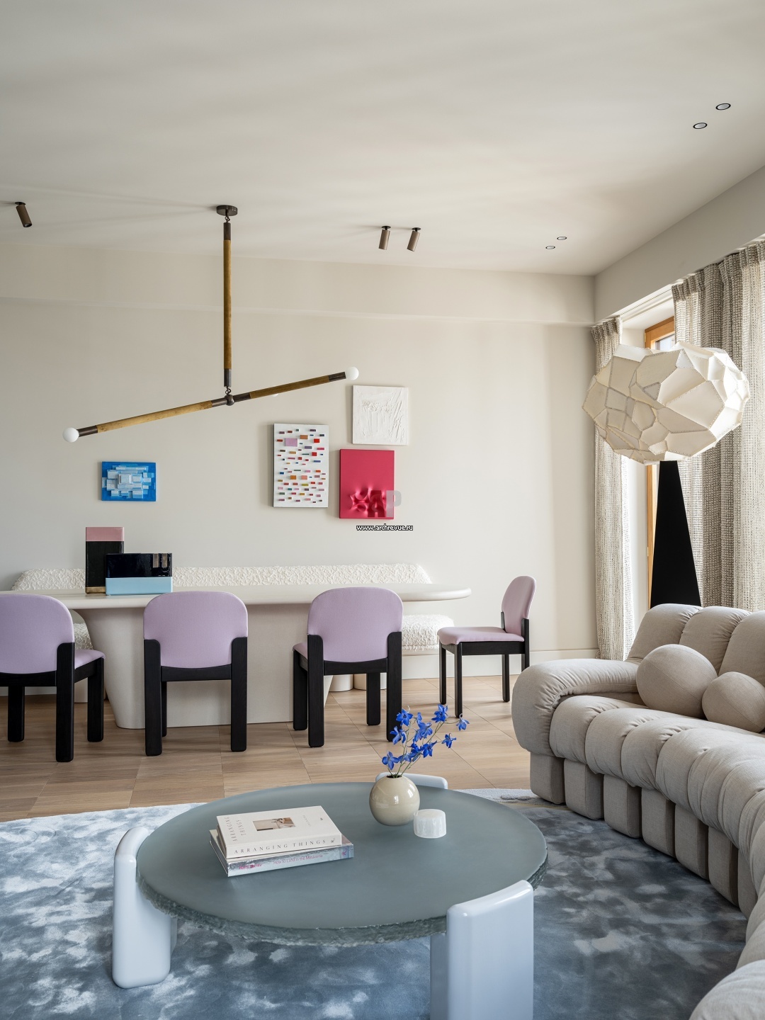 Женский интерьер с тактильными отделками и иконами мебельного дизайна. Общая гостиная-столовая. На окнах – необычная ткань крупной вязки из шерсти, напоминающая кольчугу. Шторы никогда за закрываются, за приватность отвечают рулонные полотна.