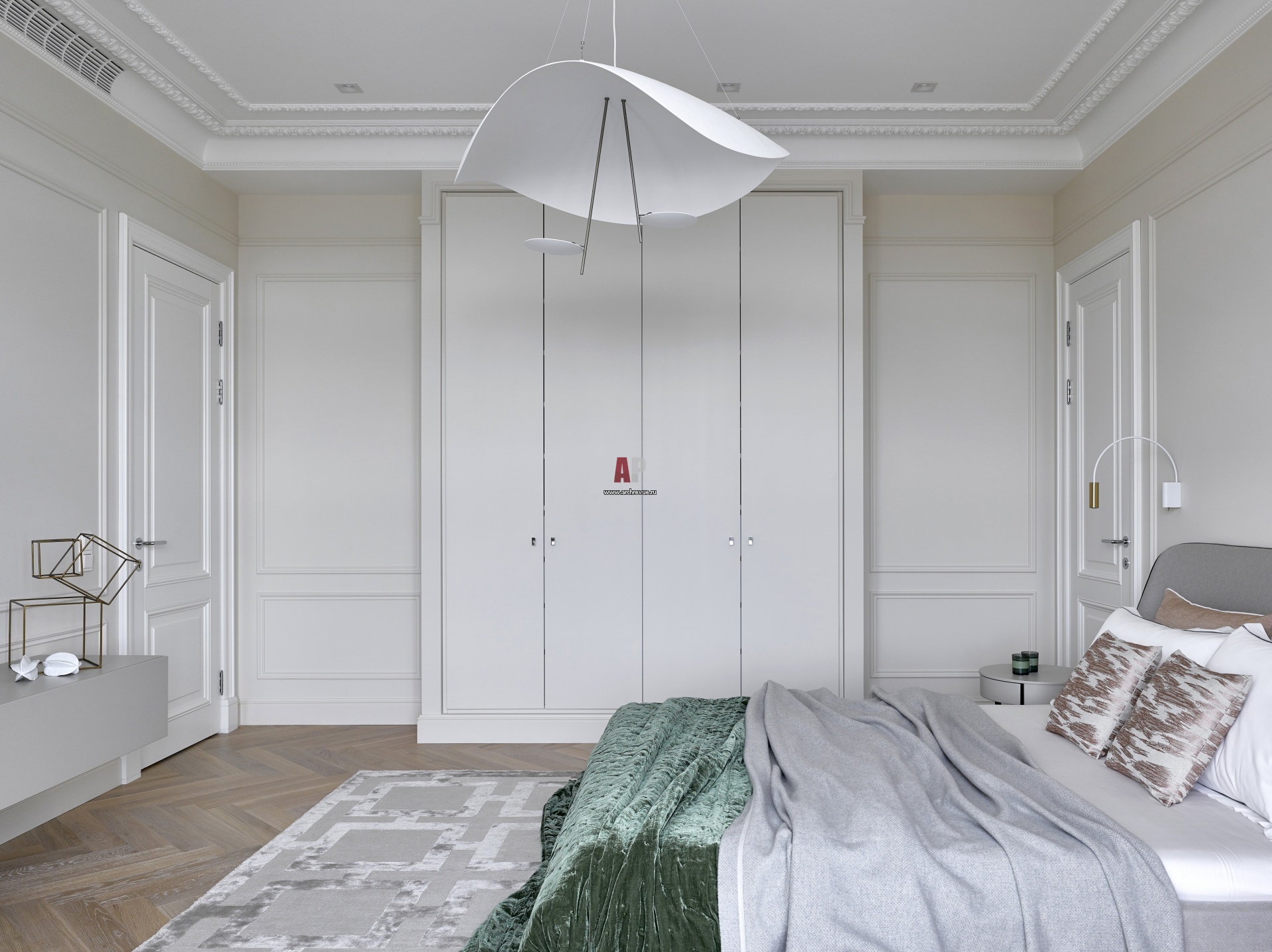 Интерьер квартиры построен по классическим законам симметрии. Спальня. Плоскость стены организует встроенный шкаф, расположенный по центру. Однотонные стены оформлены гипсовыми молдингами.