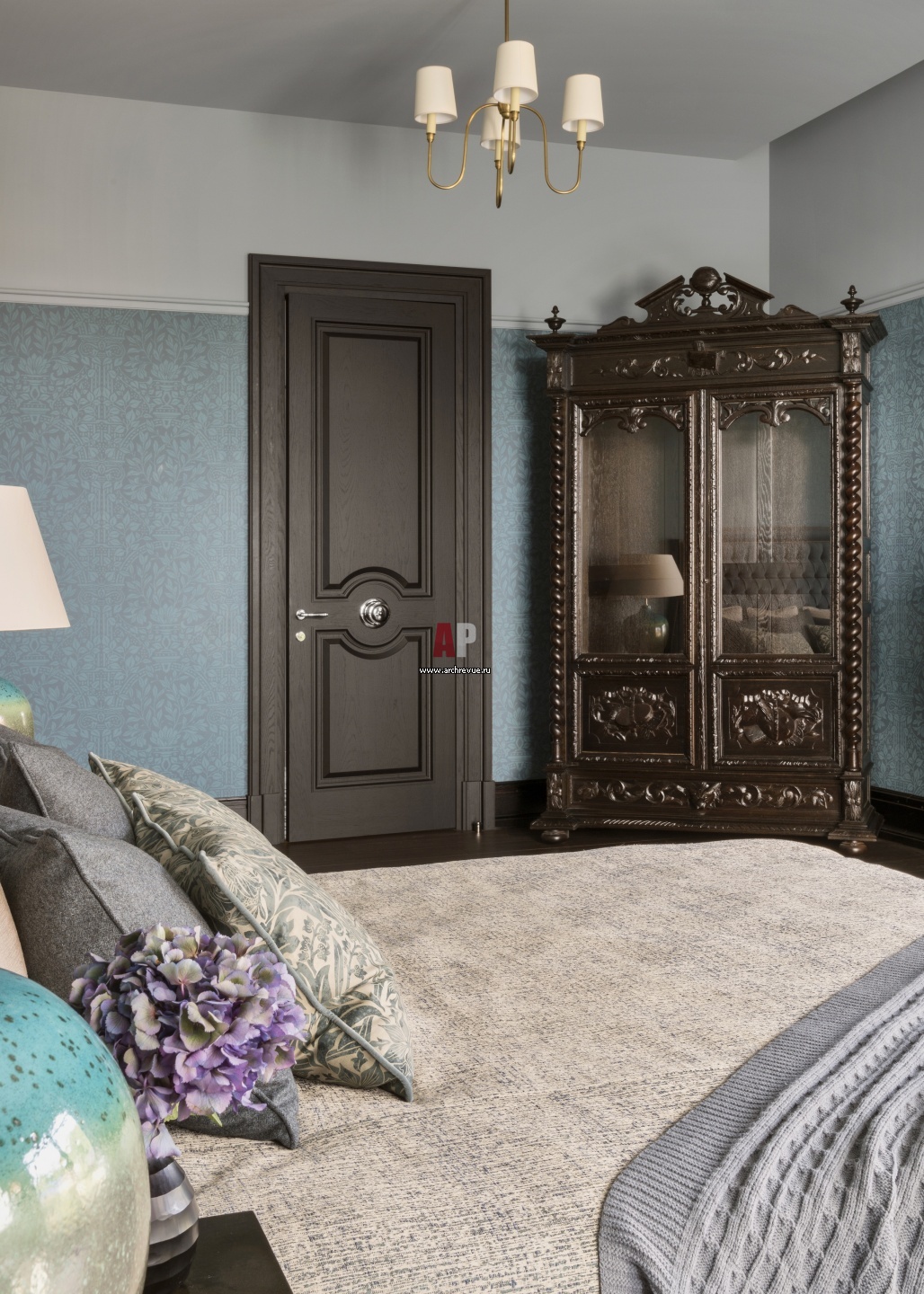 Фламандская усадьба в Подмосковье. Интерьер гостевой спальни. В оформлении стен совмещены две отделки: верх выкрашен белой краской, низ оклеен обоями синего цвета с серебристым узором.