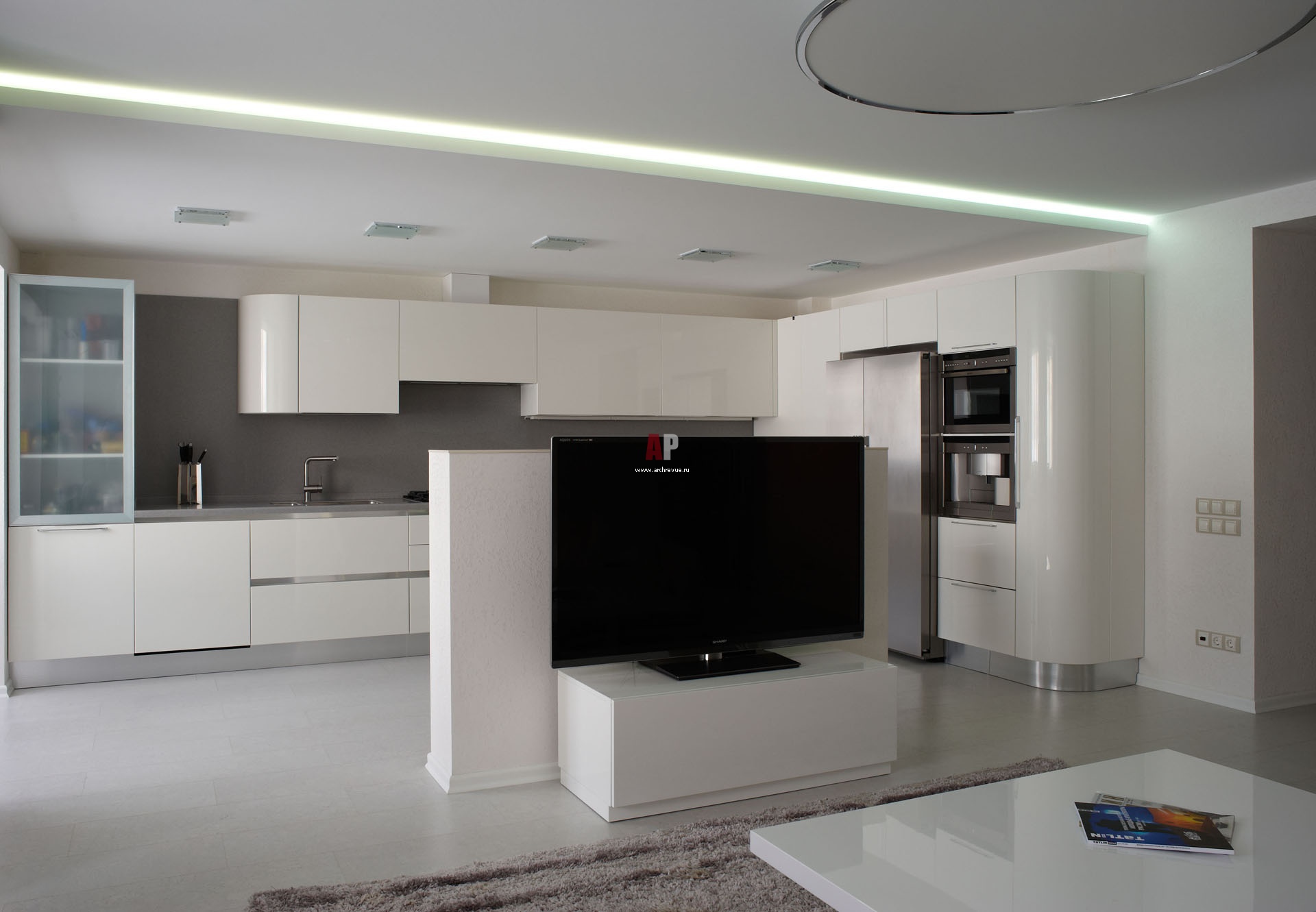 Кухня объединена с гостиной. Интерьер выдержан в бело-серой цветовой гамме. Кухонный гарнитур из белого глянца, шкафы со скругленными краями. Верхние секции открываются на нажатие.