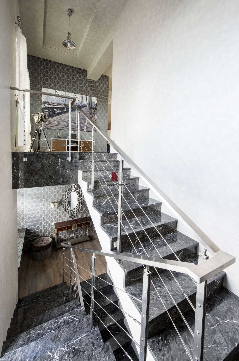 Фото лестничного холла в доме. Ограждения в виде тонких струн выполнены из металла. Ступени облицованы серым мрамором.