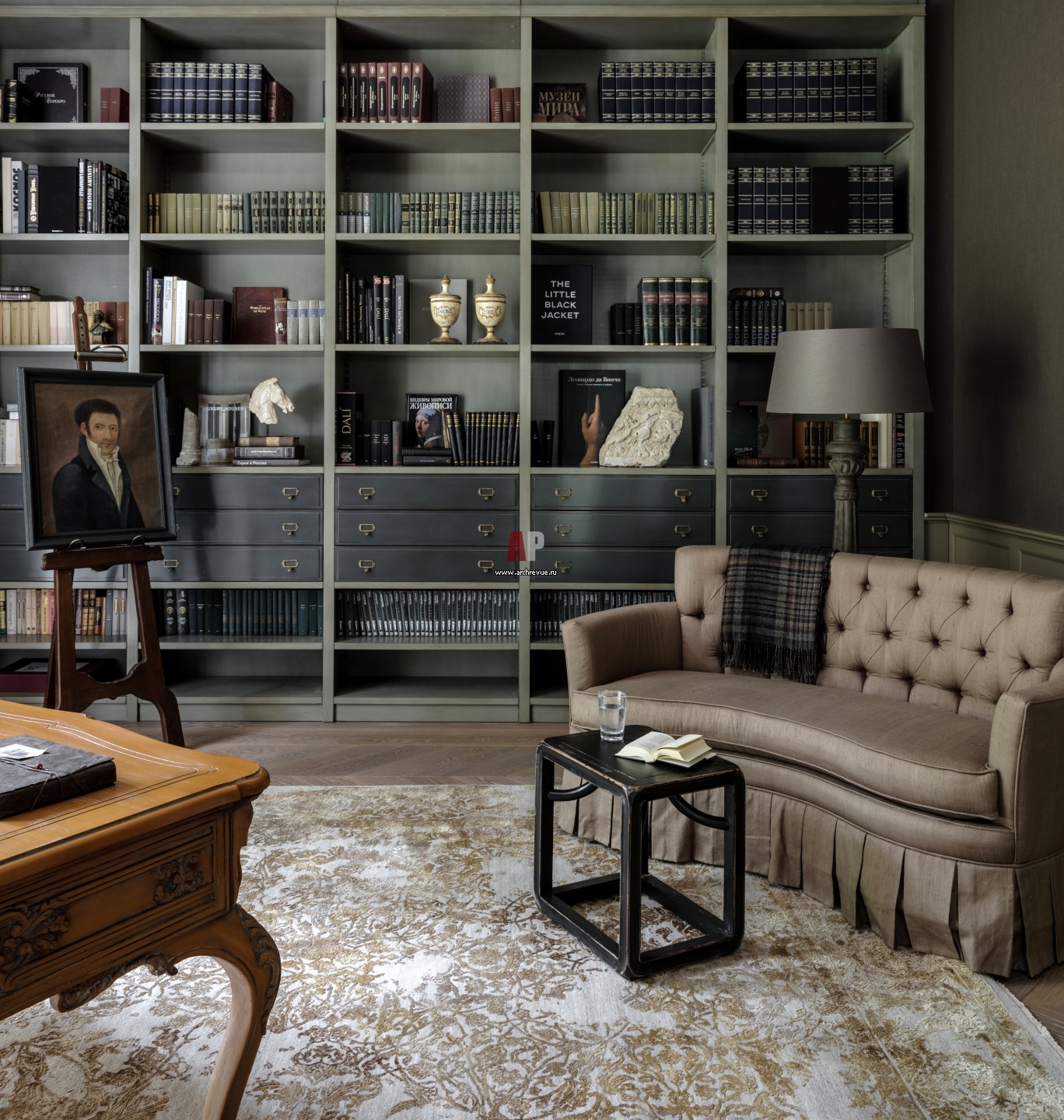 Кабинет находится на одной оси с парадной столовой. Стены в нем выкрашены в сложный коричневый оттенок. Конструкция открытой библиотеки тонирована в серый цвет. Диван, Maison Santamaria.