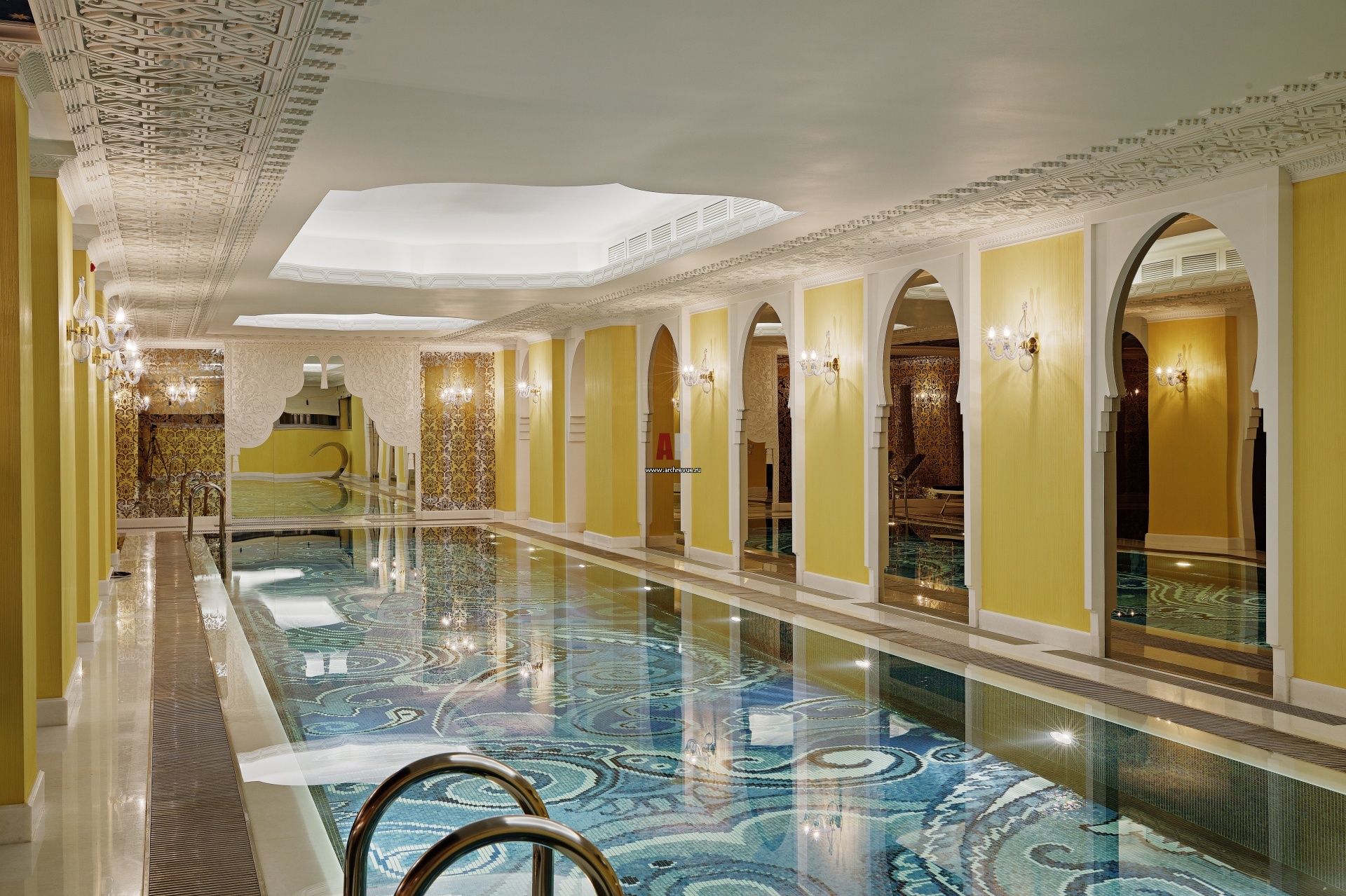 Эклектичный дом в Барвихе. Интерьер бассейна с арабскими мотивами. Здесь присутствуют традиционные стрельчатые и сводчатые элементы, мозаики, майоликовые панно, арабская геометрия, лепные детали потолка и ниш.