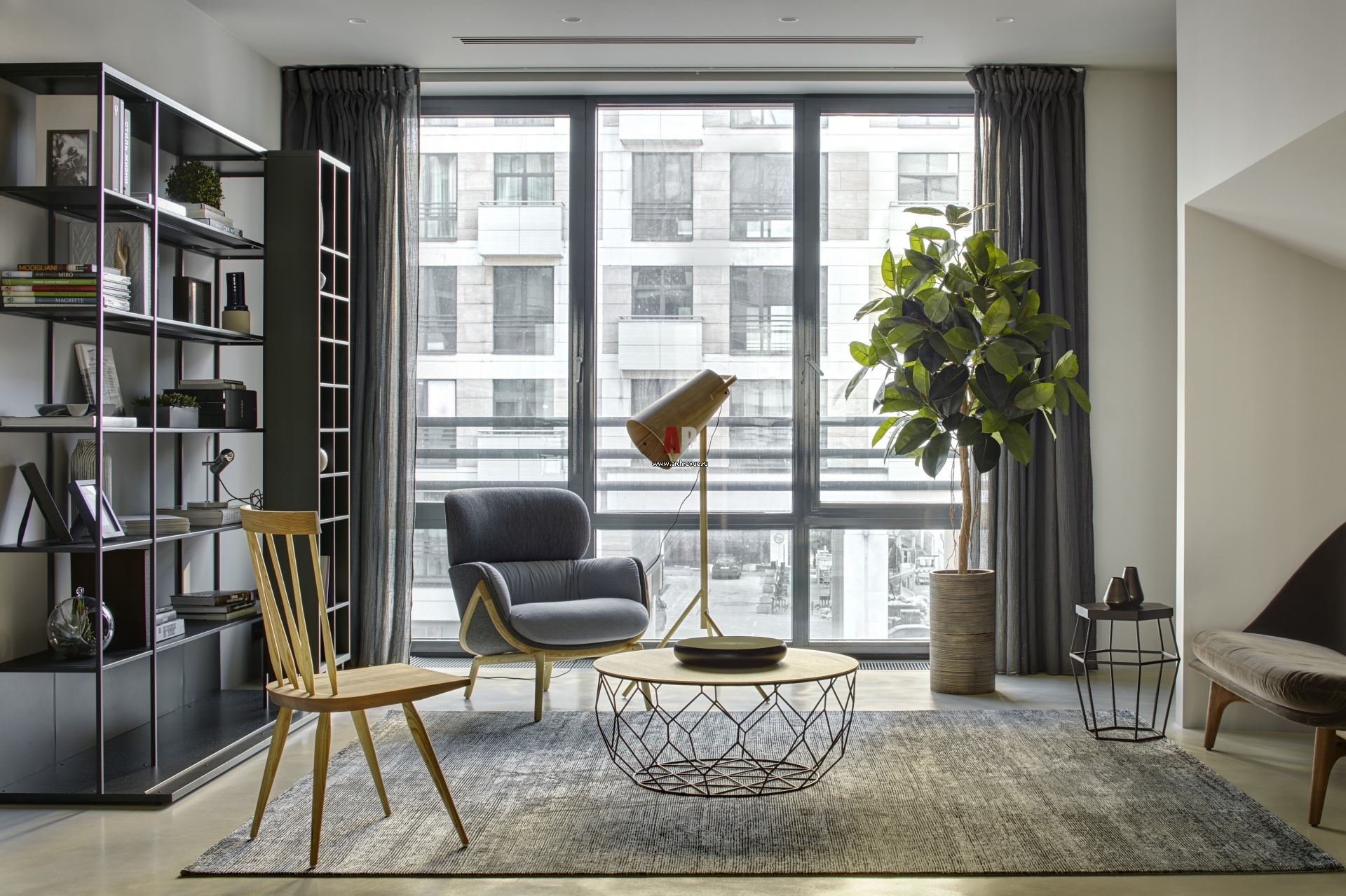 Малая гостиная решена как продолжение общего гостевого пространства. Кресло, Luca Nichetto. Торшер и столики, Bolia. Стеллаж, Punt Mobles. Искусственное дерево, Treez Collection.