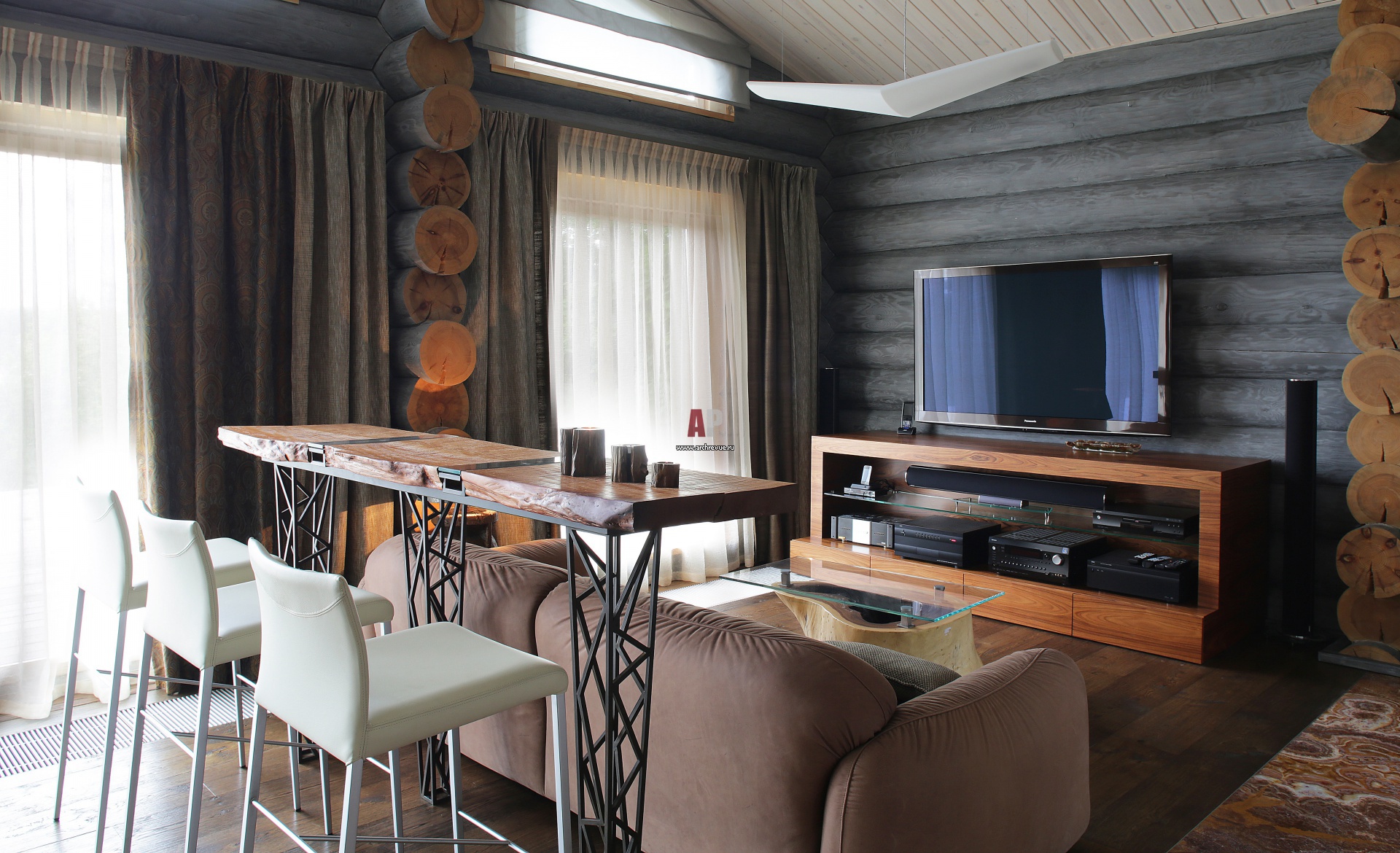 Столешница барной стойки из древесины каури была заказана на фабрике Riva 1920. Но наш климат изменил прямолинейность куска драгоценного дерева, тогда архитектор разделила его на части стеклом и металлом. Металл обработан краской, имитирующей вороненую сталь. Барные стулья, Cattelan Italia.