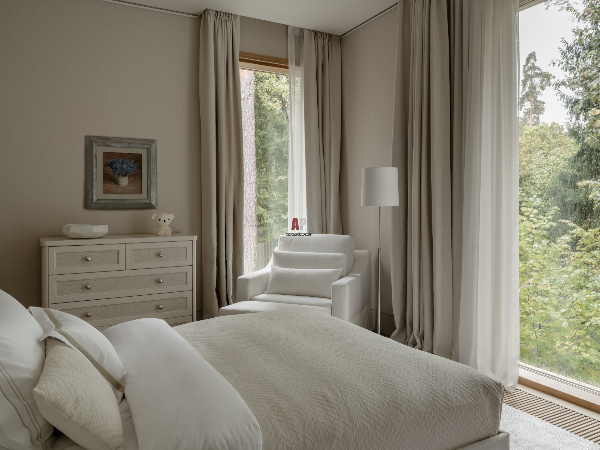 Детская спальня с панорамным окном оформлена в нежной, светлой палитре.