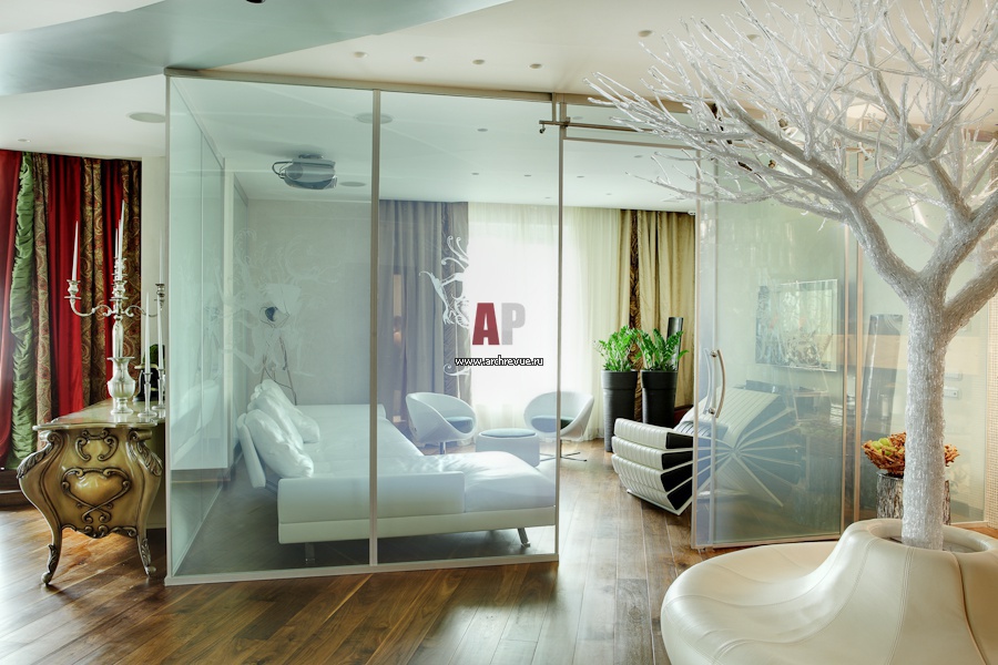 Зона домашнего кинотеатра заключена в куб из электрохромного триплекса (стекла с переменной прозрачностью) с рисунком в барочной стилистике. Изготовление, компания «Арт-бюро XXI».