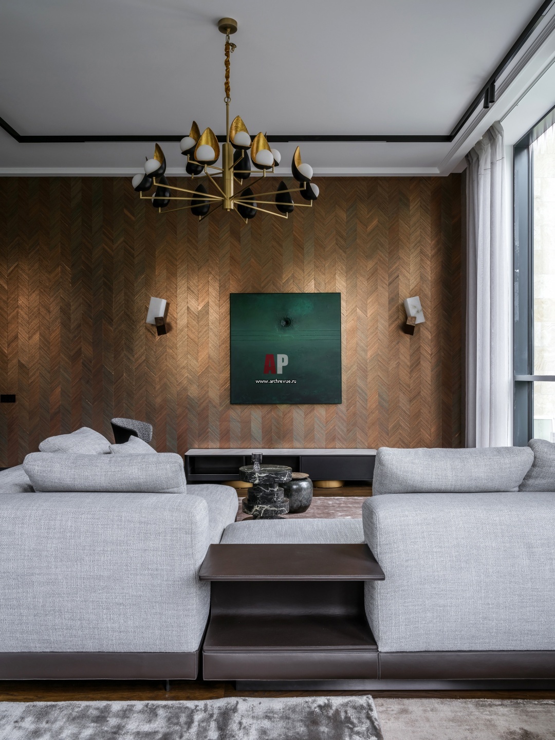 ТВ зона в гостиной выделена обоями из сизаля бронзового оттенка с изумрудными переливами. Акцентом также служит дизайнерская фольгированная люстра.