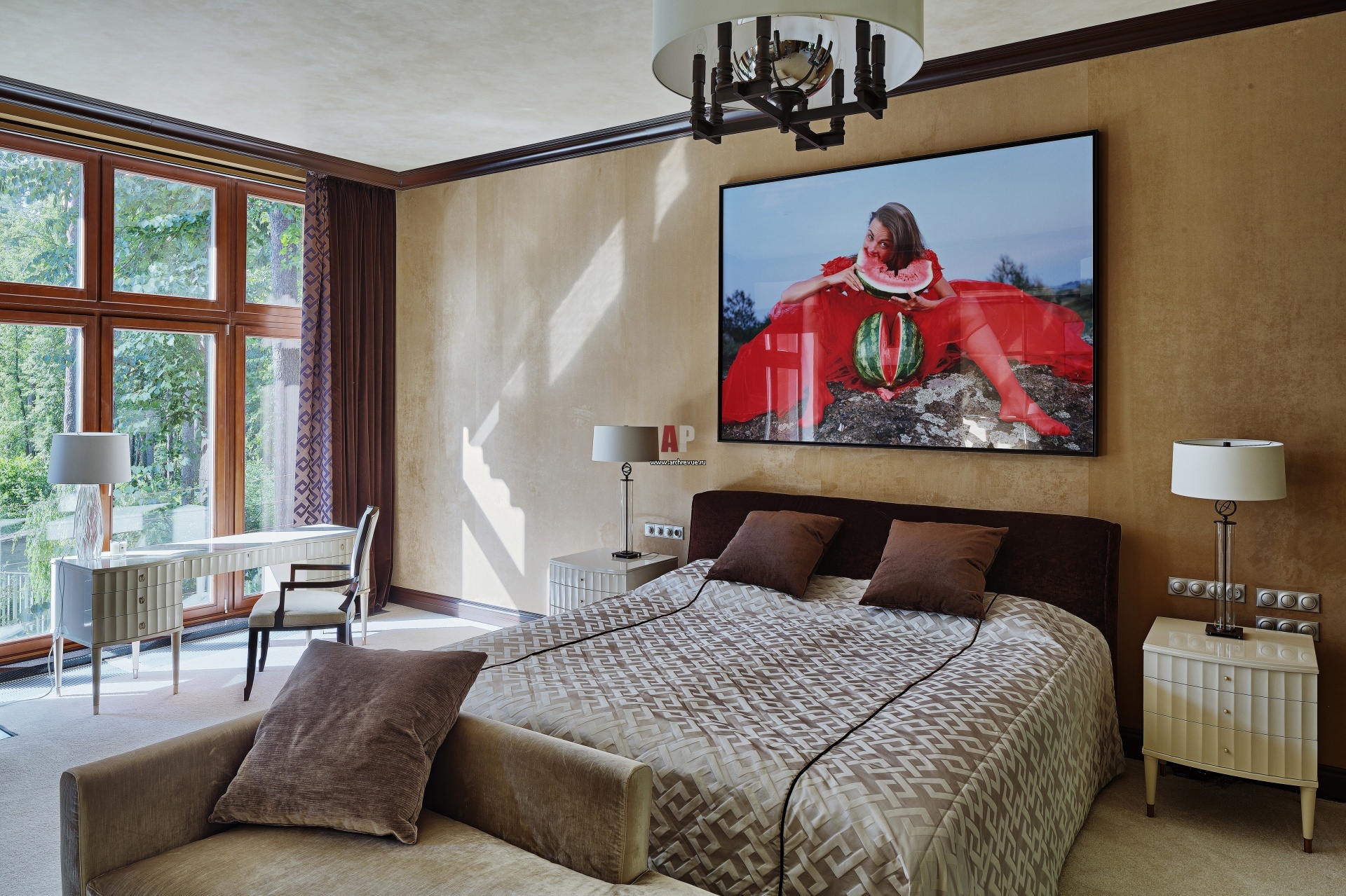 Интерьер главной спальни. Стены оформлены замшевыми обоями, на полу – шерстяной ковролин. Кровать, Treca Interiors Paris. Прикроватная тумбочка и стол, Barbara Barry. Козетка, Flexform. Над кроватью фоторабота Олега Кулика «Девушка с арбузом».
