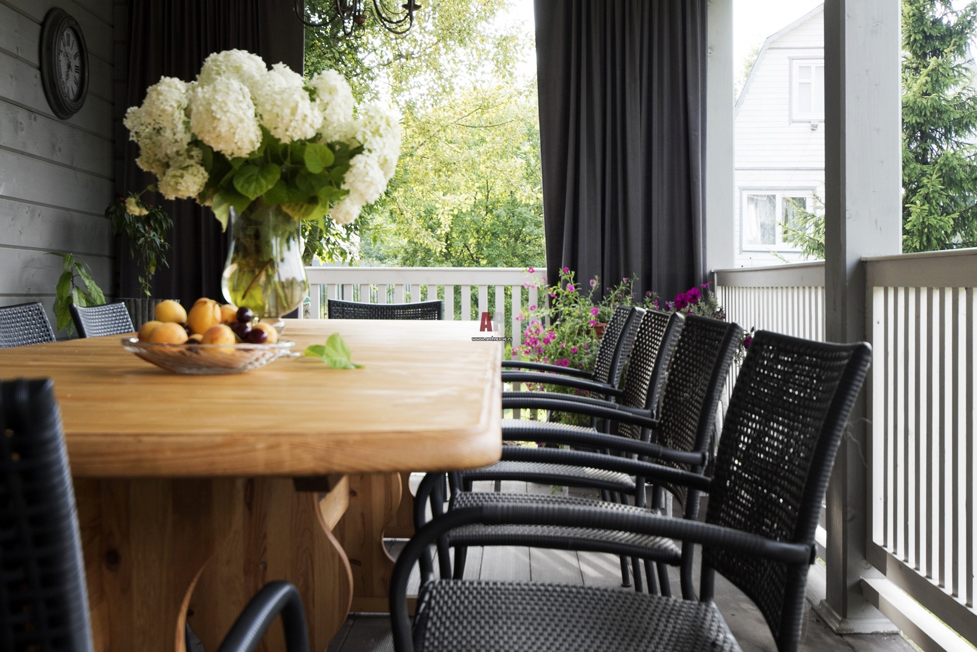 К столовой примыкает открытая терраса. Летом, при открытых дверях столовая-веранда-сад логично продолжают друг друга, а интерьер сливается с ландшафтом.
