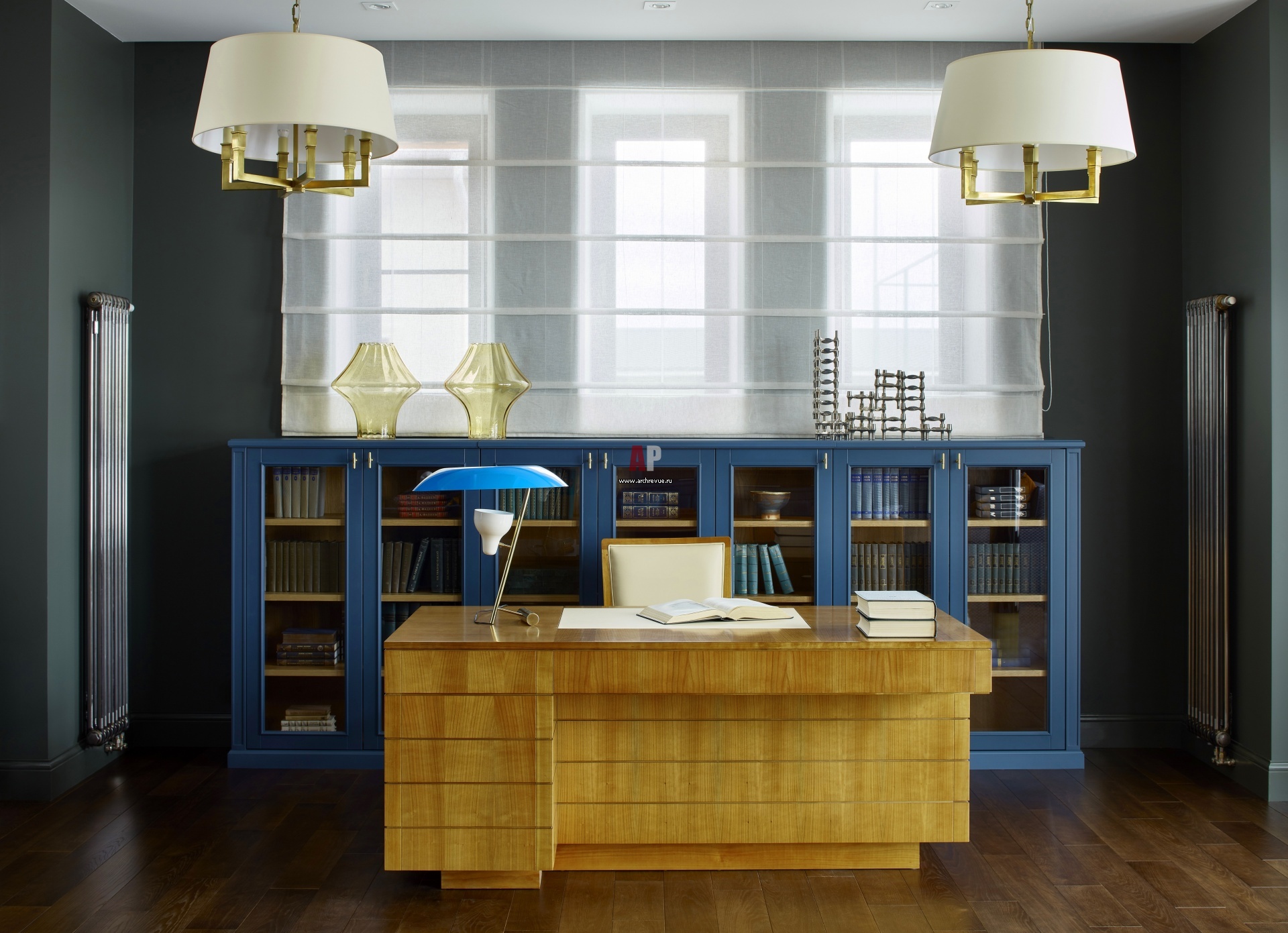 Интерьер библиотеки с зоной кабинета в насыщенном синем цвете. Синий библиотечный шкаф, на заказ. Рабочий стол и кресло, Morelato. Настольная лампа, Flos.