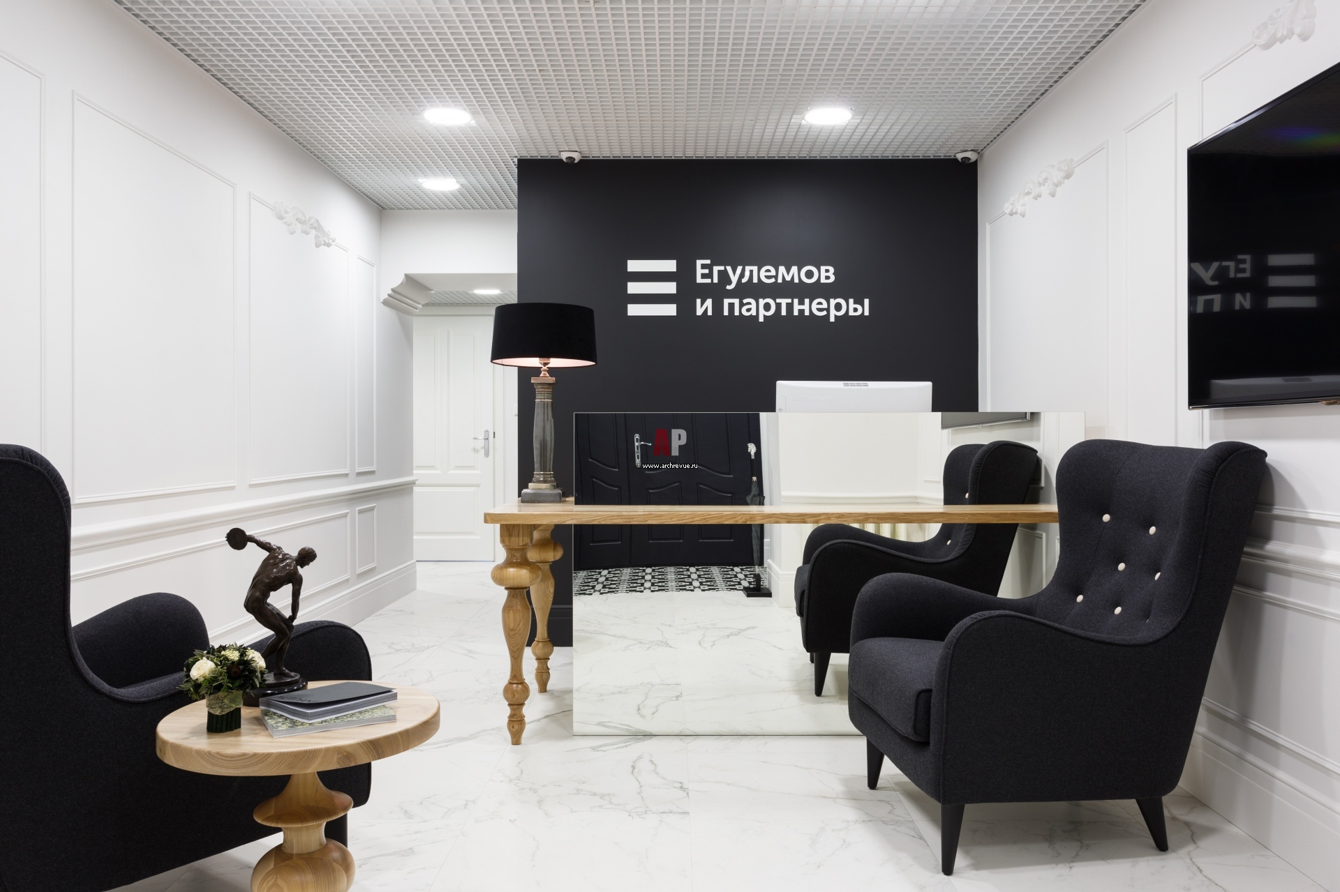 При входе в офис стоит рецепция с резными ножками из светлого дерева, которая выполнена на заказ по эскизам. В небольшом помещении она не выглядит громоздкой благодаря зеркальной вертикальной поверхности. Массивные черные кресла контрастируют белыми стенами и полом.