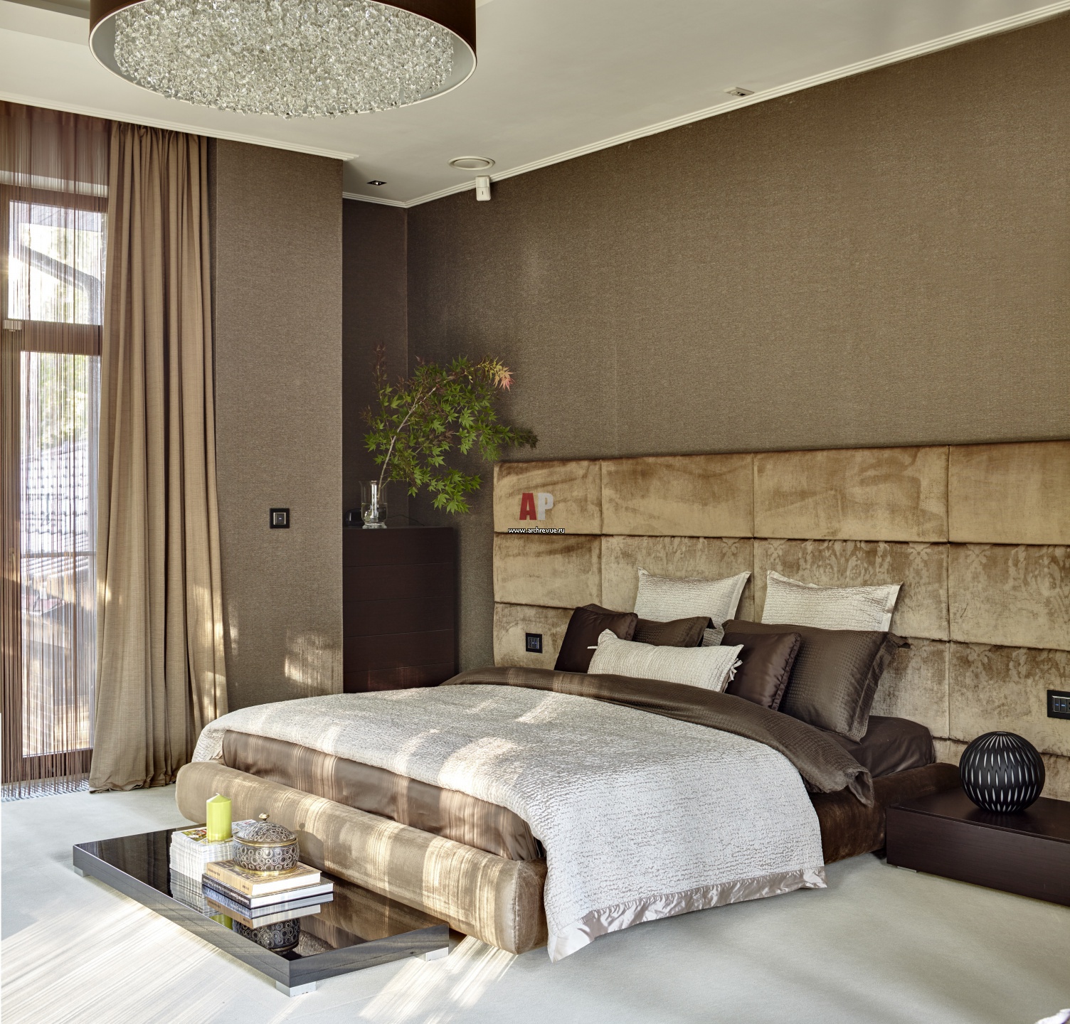 Хозяйская спальня с панорамными окнами образовалась в результате присоединения открытых террас. Кровать и прикроватные тумбы, Poliform. Комод, Pianca. Текстиль, The White Company.