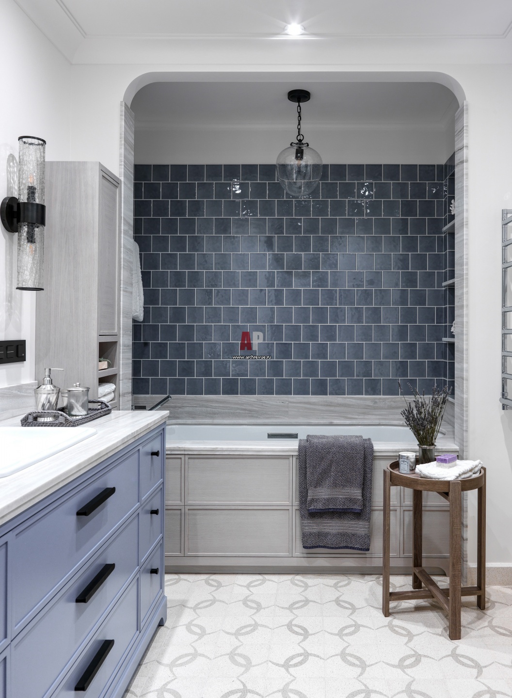 Ванная комната при хозяйской спальне. С помощью двух альковов помещение разделено на условные зоны: в одной расположена ванна для домашних СПА-процедур, в другой – душевая и унитаз. Стены частично облицованы плиткой Marlborough. На полу – клинкерная французская плитка, изготовленная на заказ в индивидуальных цветах, Mosaic del Sur. Также в отделке использован мрамор Nestos Beige в отделке «лощение». Сантехника, Villeroy & Boch, Dornbracht, Bette.
