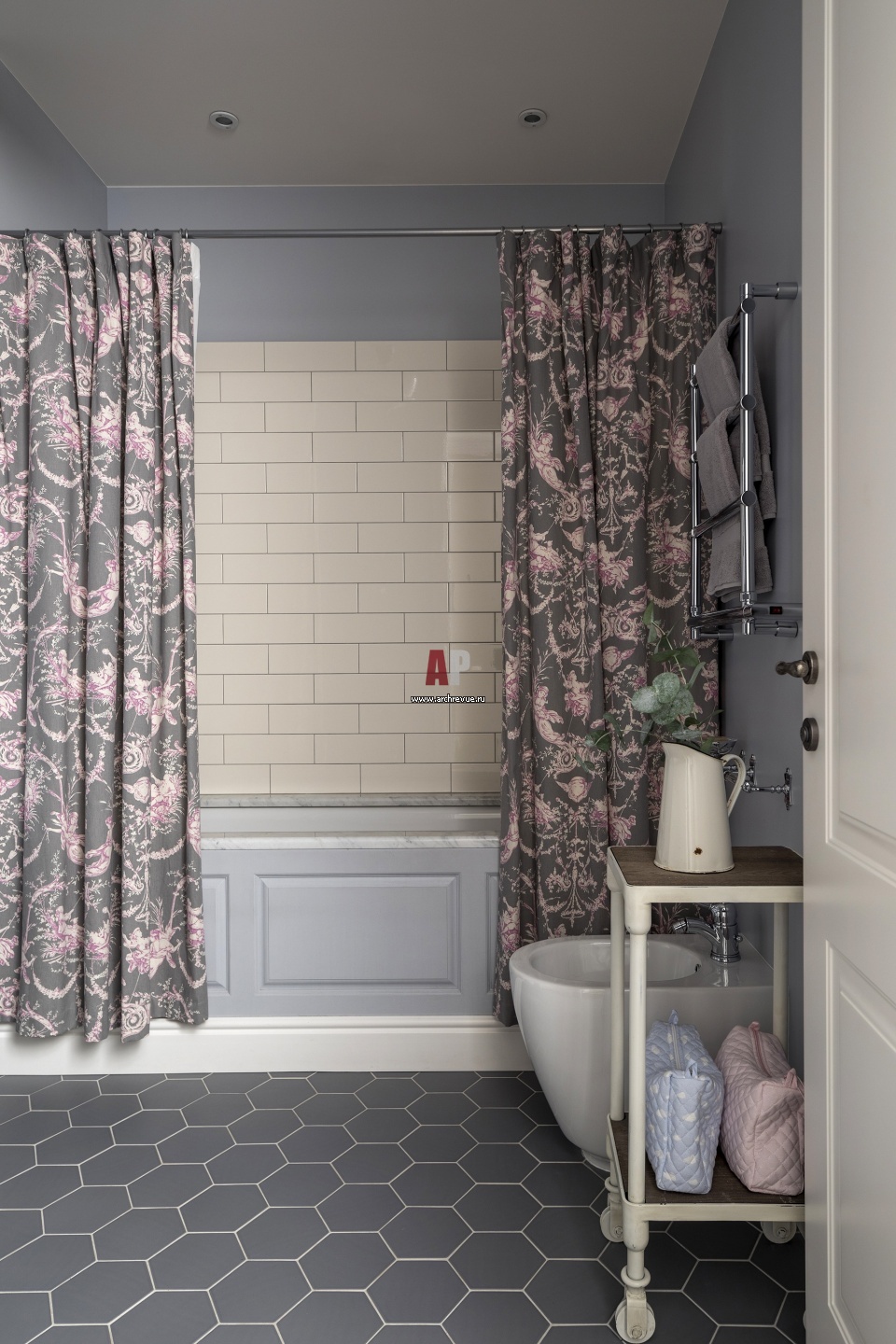Квартира с эффектом благородной старины. Интерьер ванной комнаты. Смесители, Hansgrohe. Штора для ванны индивидуального пошива.