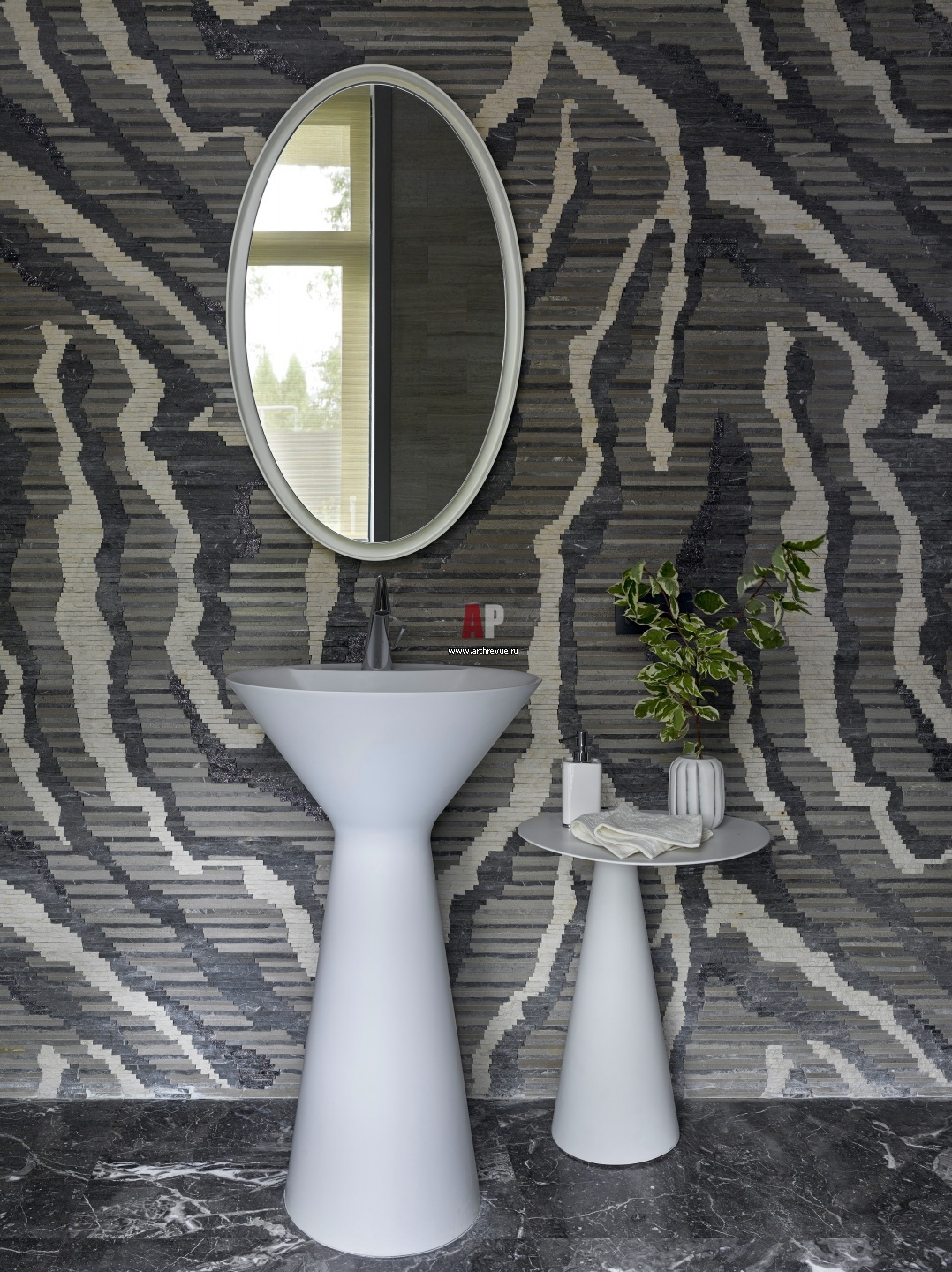 Стена за умывальником в гостевом санузле выложена мозаикой из природного камня, Petra Antiqua. Раковина, смеситель, столик, Gessi. На полу – серый мрамор.
