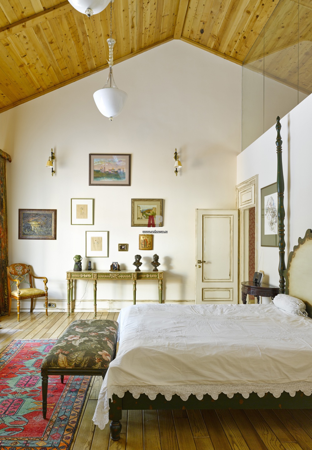 Хозяйская спальня имеет высокий потолок. Верх одной из стен сделан из стекла, что делает интерьер светлым и полным воздуха.