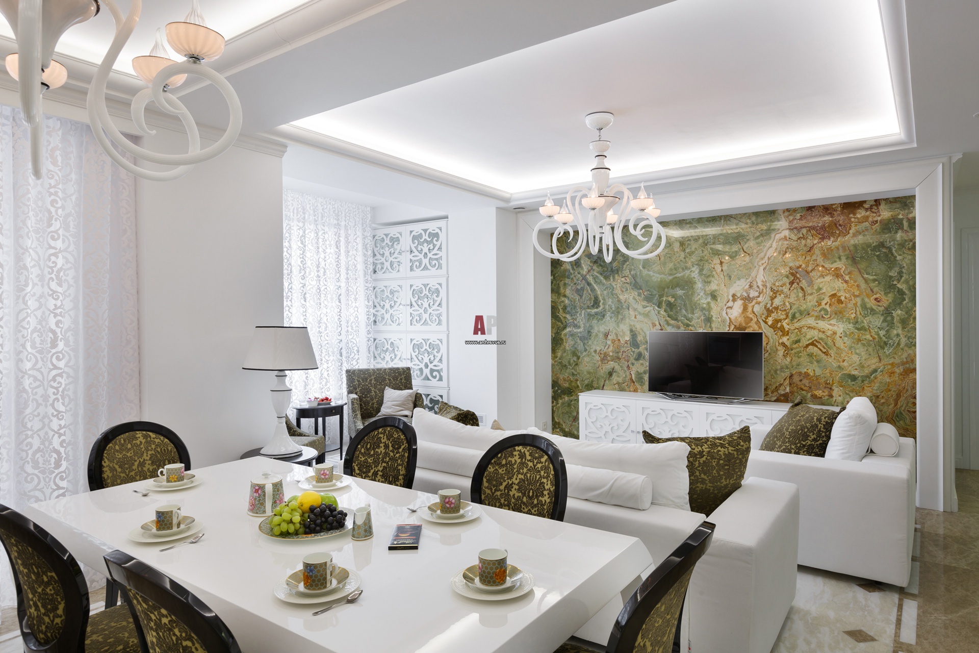 Фото интерьера гостиной, объединенной с кухней-столовой в современном стиле с классическими мотивами. Изящная люстра из белого муранского стекла.