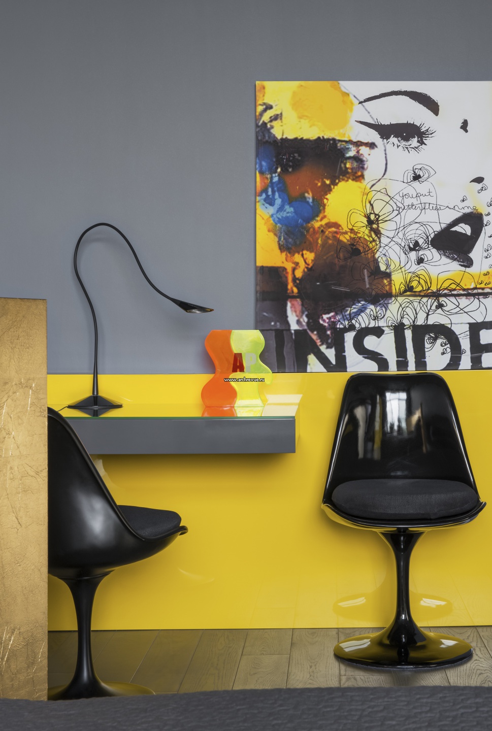 Фото интерьера спальни дочери в дизайнерской квартире. Письменный стол, Pianca. Стулья, Eero Saarinen (модель Tulip chair). Ваза дизайна Карима Рашида, постер, BoConcept.