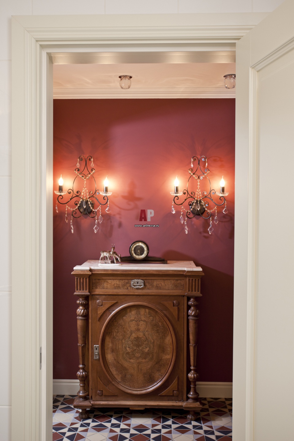 Декоративный акцент прихожей – антикварный шкаф из семейного наследия заказчика. Отреставрированные фасады с инкрустацией из корня ореха.