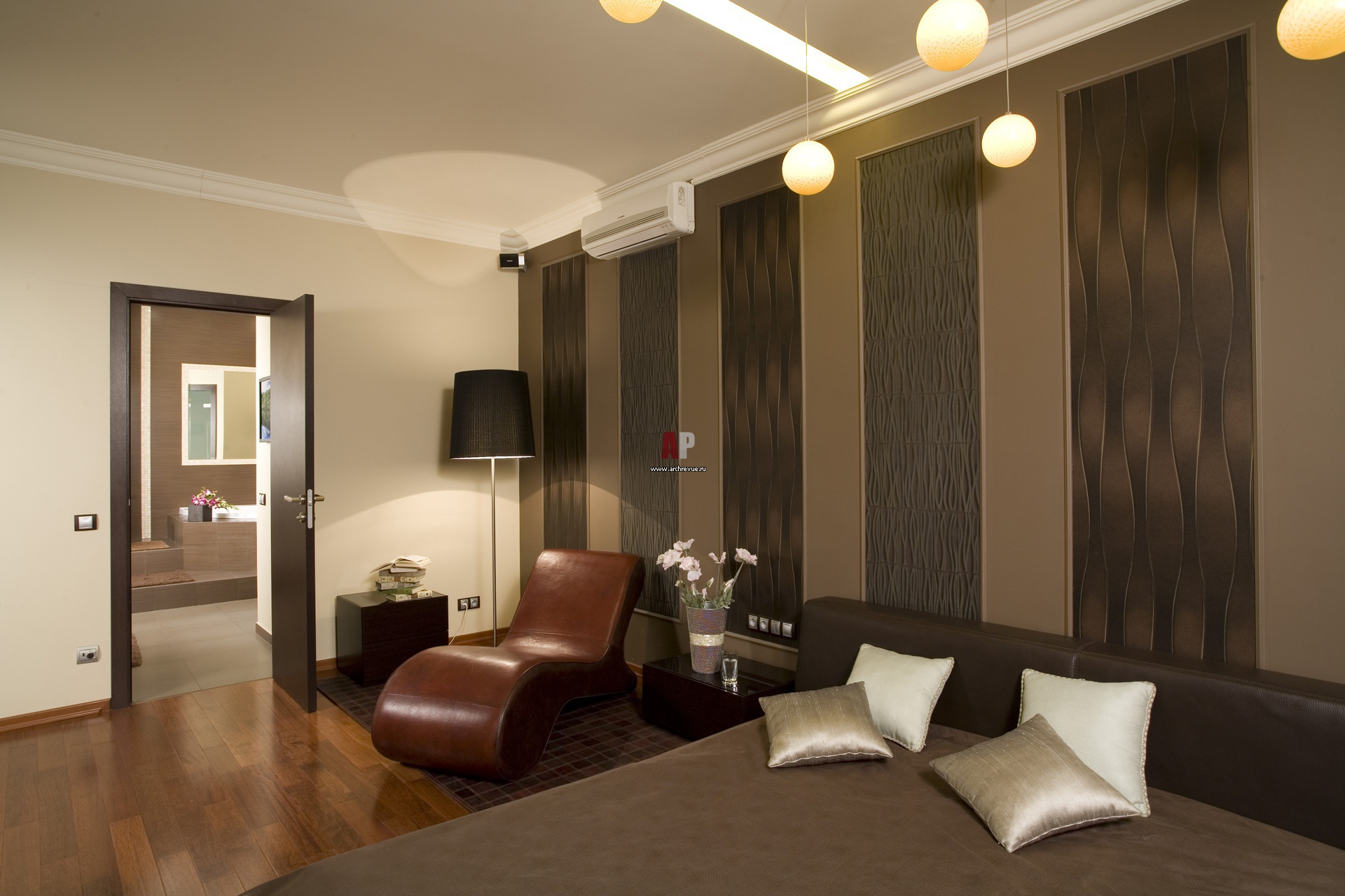 Хозяйская спальня в теплых коричневых тонах. Окрашенная стена оклеена несколькими полотнами обоев, разными по рисунку, но из одной коллекции. Края отделаны тонким молдингом из пенополиуретана.