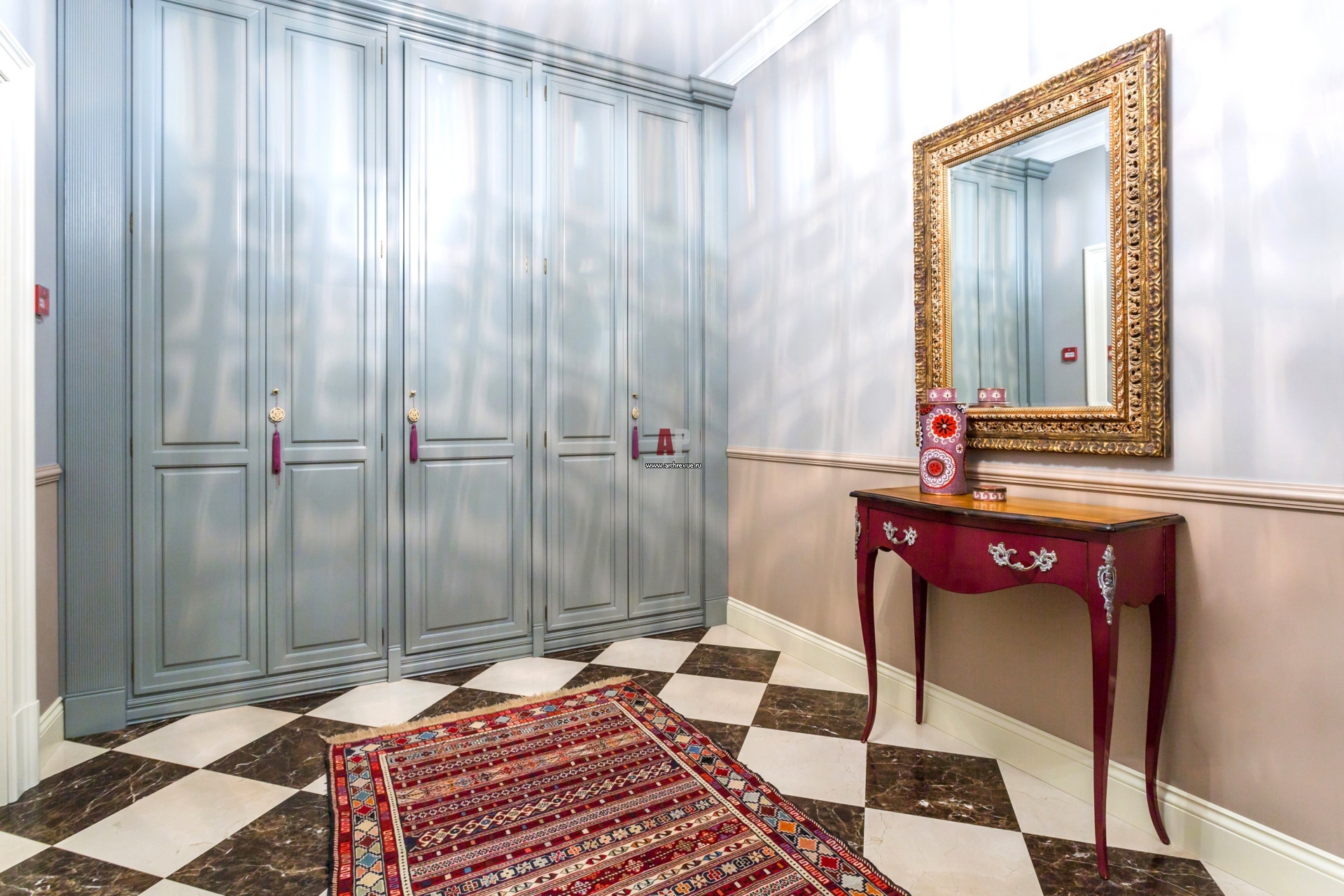 Пол в прихожей выложен мрамором двух оттенков в виде крупных ромбов. Гардеробный шкаф нежного серо-голубого цвета с классическими филенками сделан на заказ.