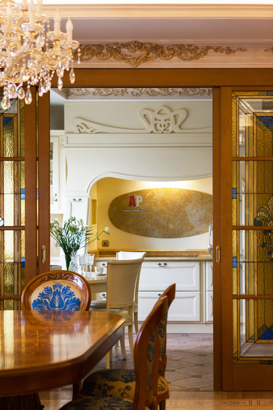 Вид из столовой на кухню через раздвижные витражные двери. Овальный обеденный стол украшен маркетри, Asnaghi Interiors.