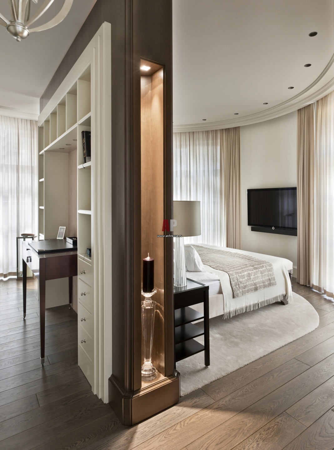 Дубовая перегородка в спальне делит зону сна и будуар. Одновременно она служит изголовьем кровати, с другой стороны – в нее встроен туалетный столик.