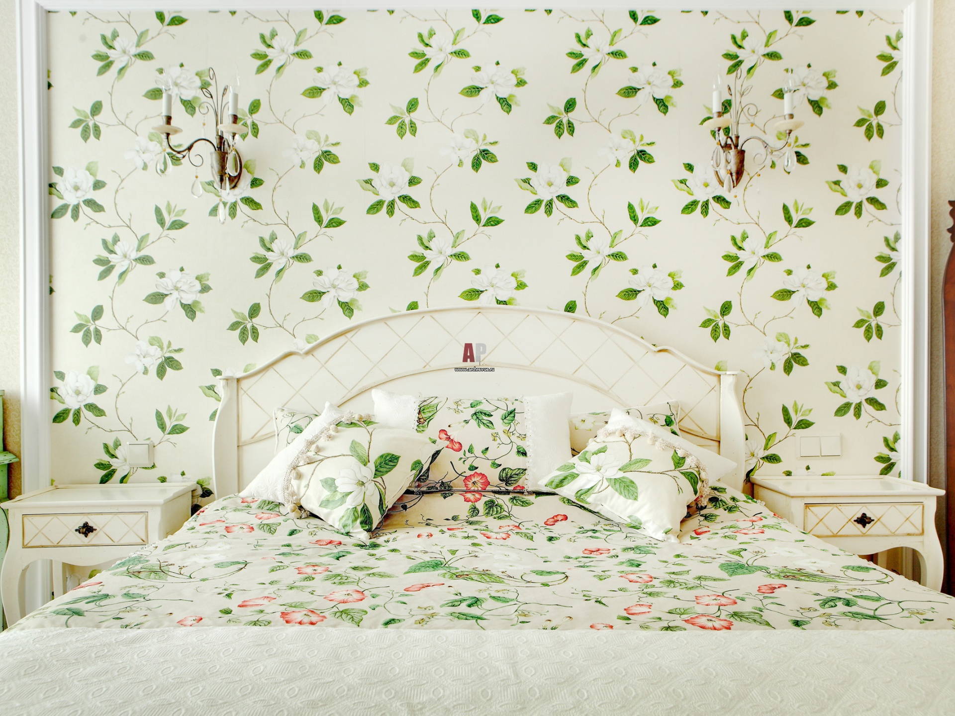 Спальня – самое французское помещение в доме. Изголовье кровати декорировано обоями с цветами гортензии. Кровать Roche Bobois.