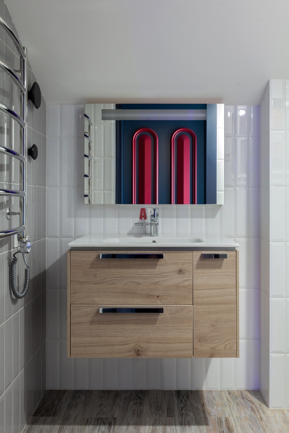 Интерьер санузла. В зеркале отражается красно-синяя дверь. Все двухцветные двери в доме сделана на заказ в духе уличных дверей Лондона и Дублина, «МН».