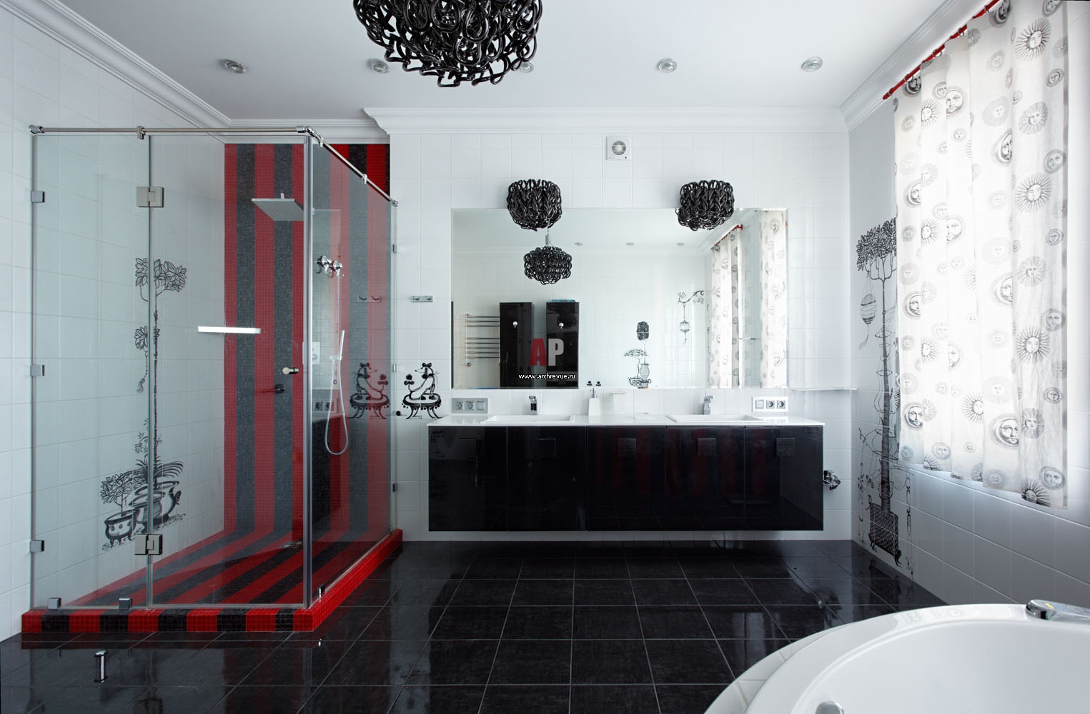 Душевая кабина в хозяйской ванной выполнена в строительном исполнении. Стеклянные перегородки заказаны на фабрике Hueppe (Германия).