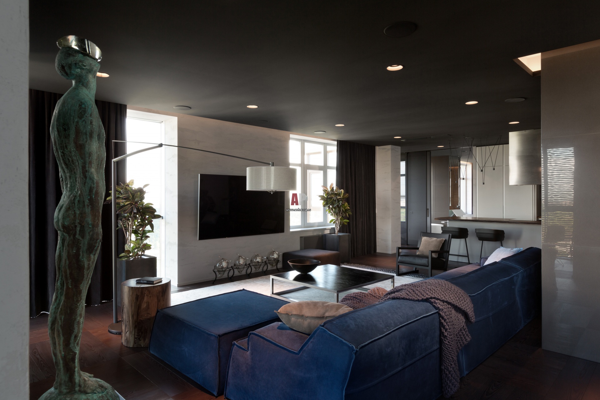 Стена, на которой размещен экран ТВ, оформлена декоративной штукатуркой с фактурой камня. Диван с обивкой из синей замши, Baxter.