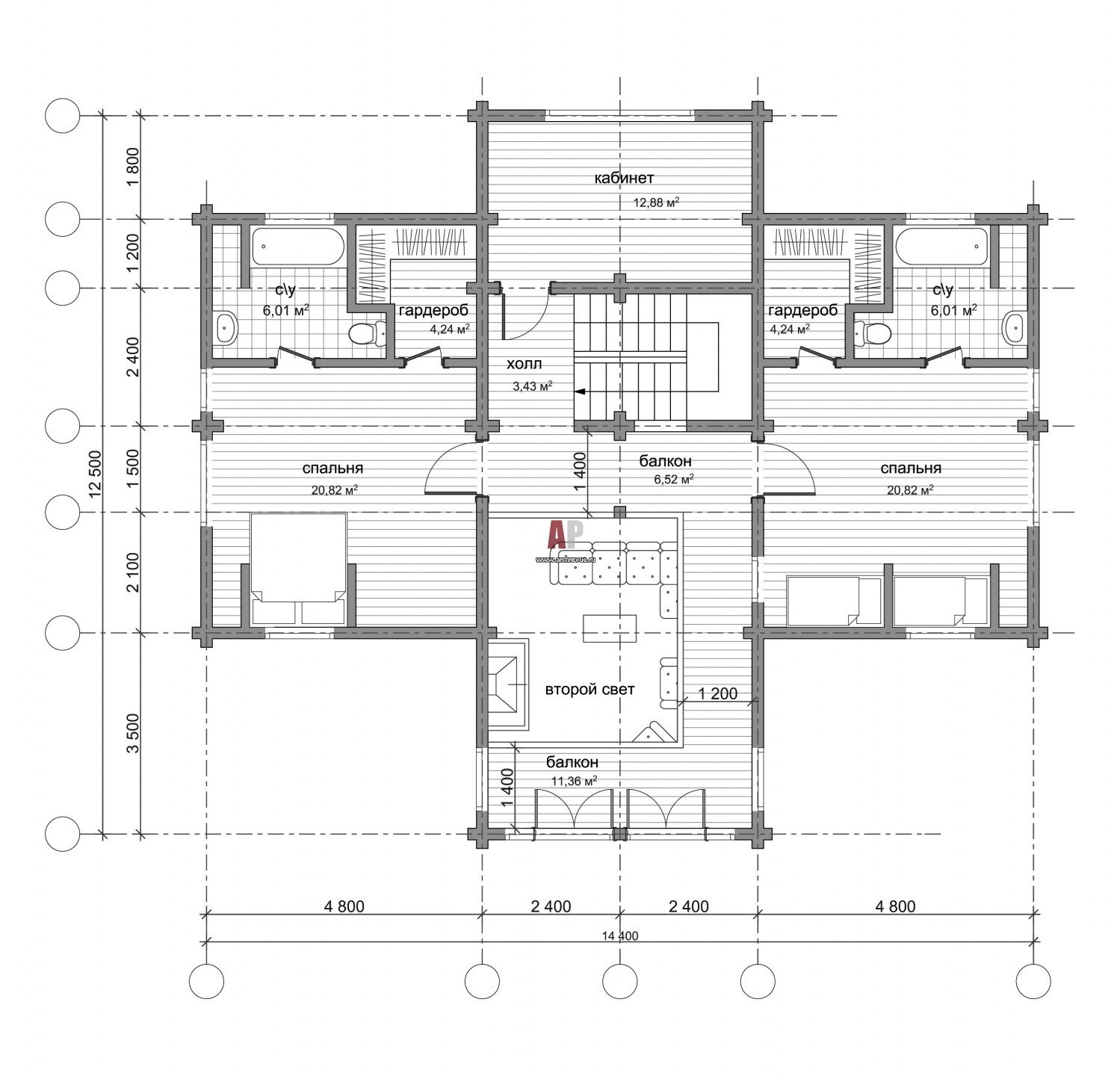 План второго этажа двухэтажного деревянного дома в Подмосковье. Общая площадь - 490 кв. м.