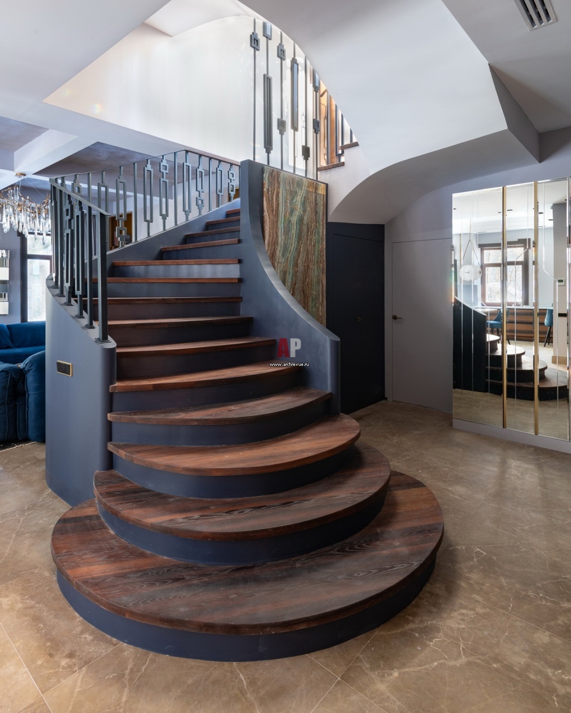 К недостаткам застройщика можно отнести изначально неудобную и некрасивую лестницу, она была выполнена из бетона и находилась по центру общего пространства и потому портила вид всей гостевой зоны. Архитекторы закруглили ступени, смонтировали вертикальный слэб из оникса и установили в металлическое ограждение световую инсталляцию, и лестница заиграла по-новому.