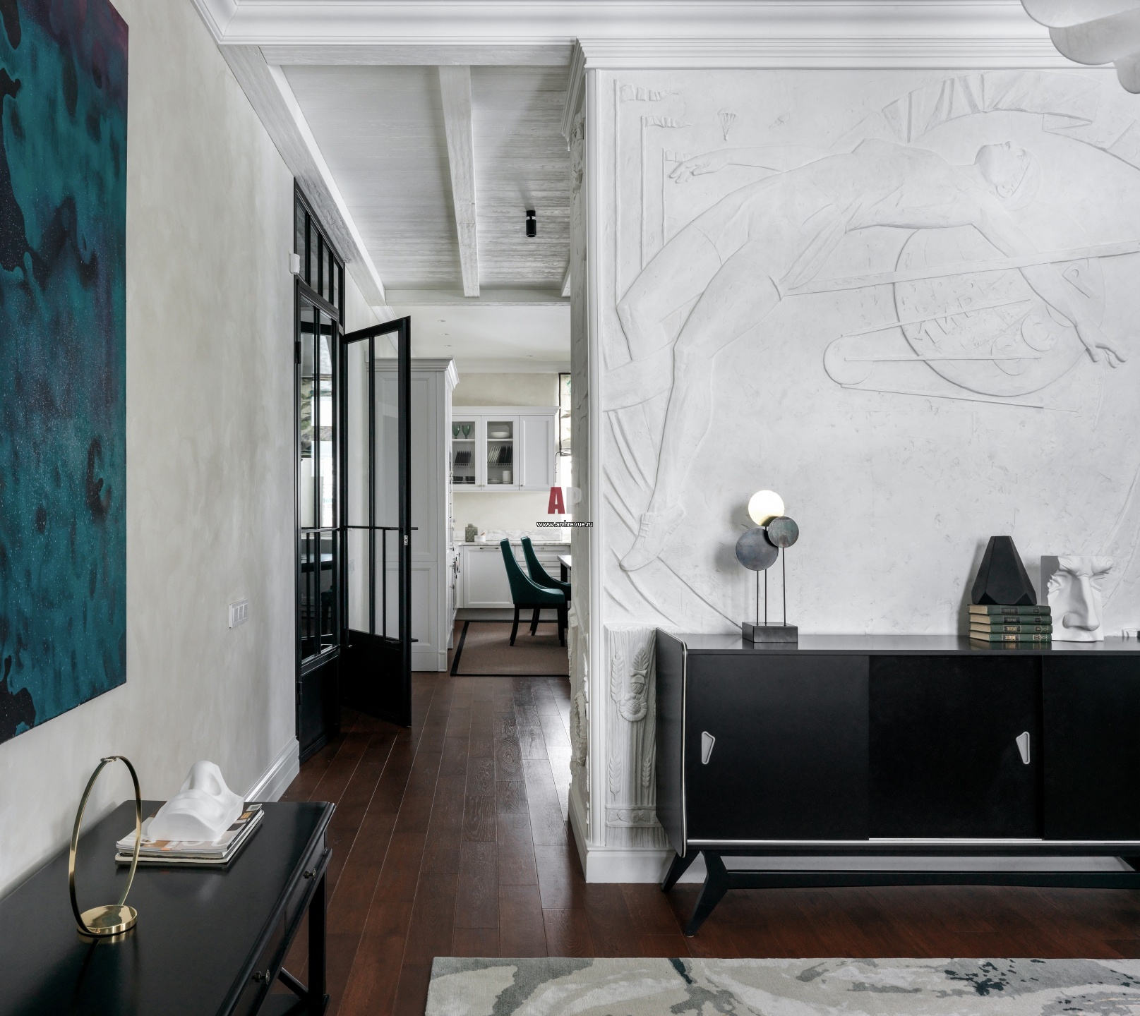 Дом с декором в духе соцреализма. Стена с обеих сторон оформлена гипсовыми барельефами с сюжетами на тему советского спорта. Автор эскизов барельефов – художник Александр Федоров.