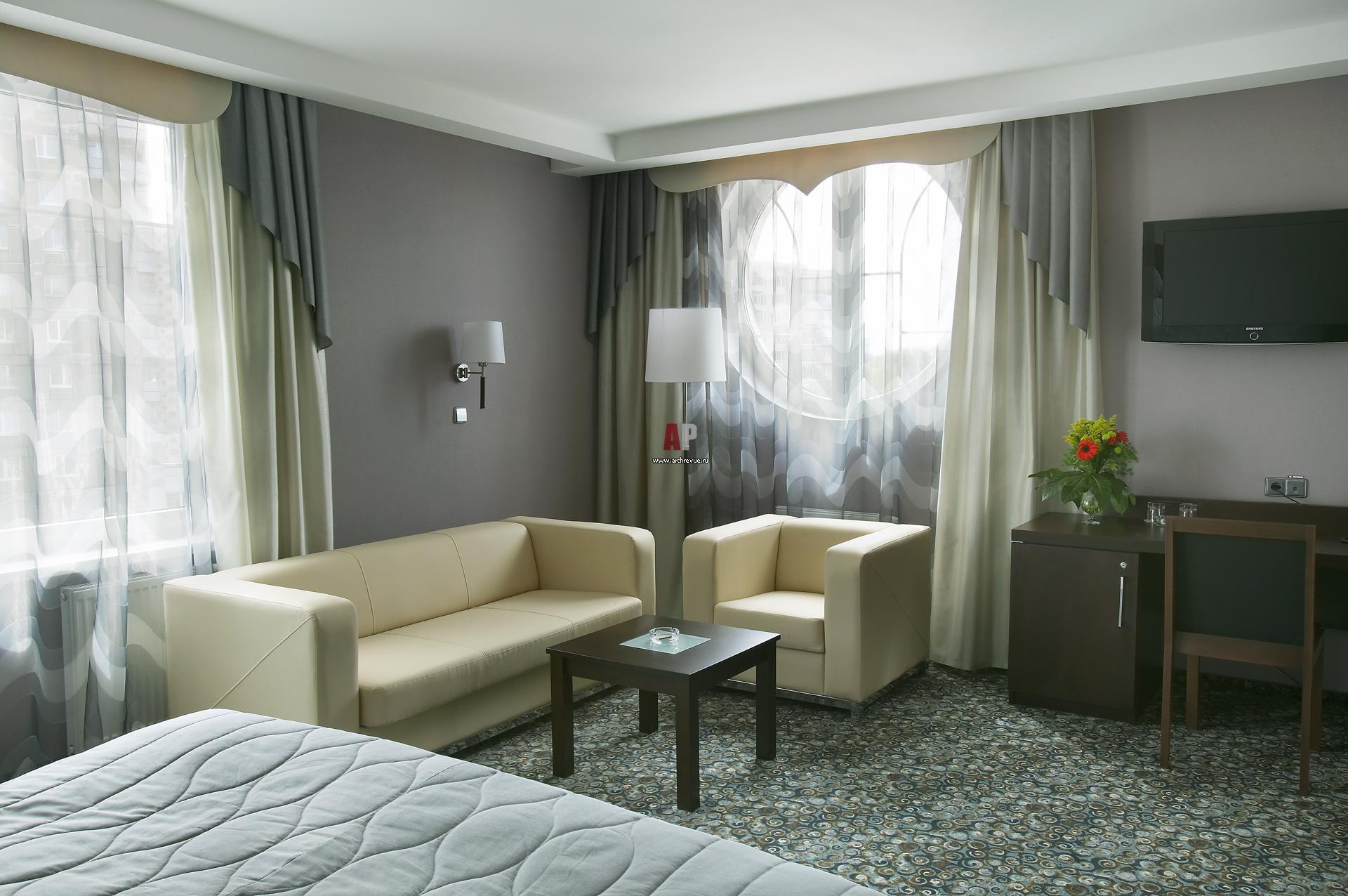 Отделка номеров лаконична. Ставка сделана на серебристо-сиреневую цветовую гамму, которая способствует расслаблению. Обои Vescom, поставщик «Ортграф компани», ковролин Ege, поставщик «Ортграф компани»
