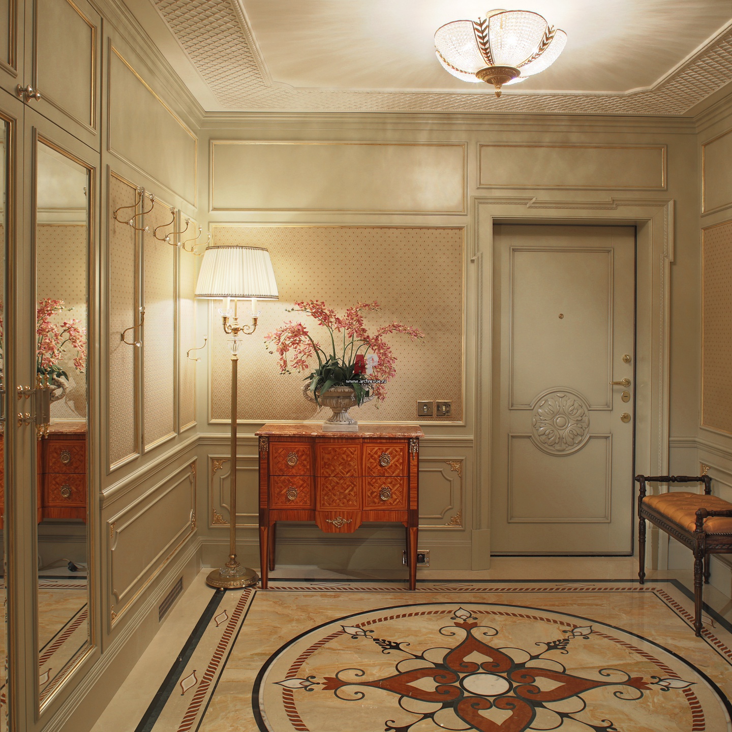 Потолок входного холла украшен лепной сеткой-трильяж из гипса. Деревянные буазери и мраморная розетка созданы по индивидуальным чертежам и эскизам. Светильники, Martinez Y Orts S.A.. Комод, Balzarotti. Все – поставщик Charles.Cameron.