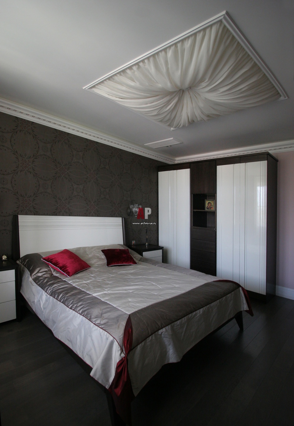На стенах спальни – обои серебристо-серого цвета с английским орнаментом.