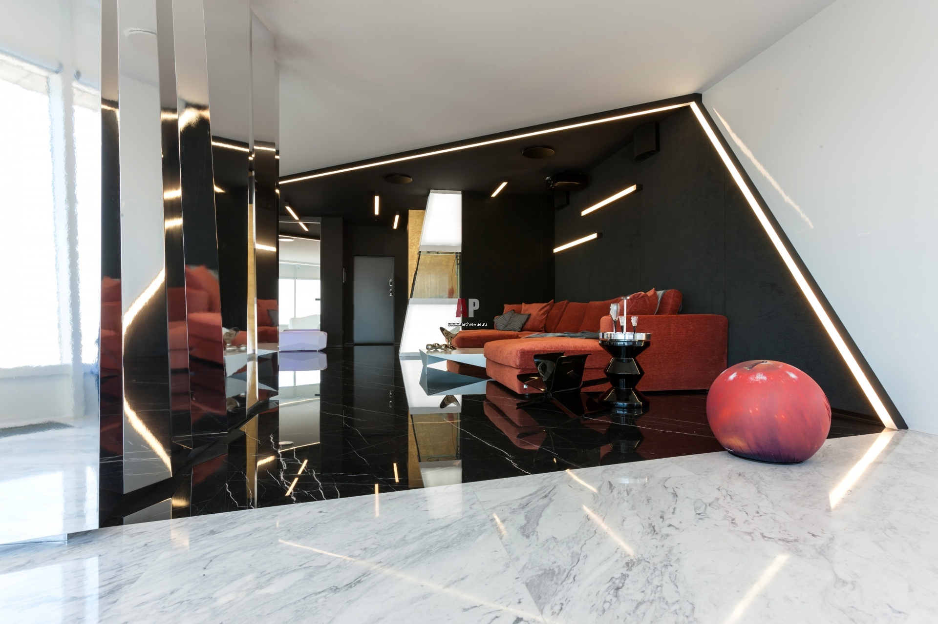 Центральная часть общей зоны выделена черным мрамором и темными стеновыми панелями, их ломаная форма подчеркивает динамичную сущность модернистского пространства. Красный диван, Busnelli. Столик, Bonaldo.