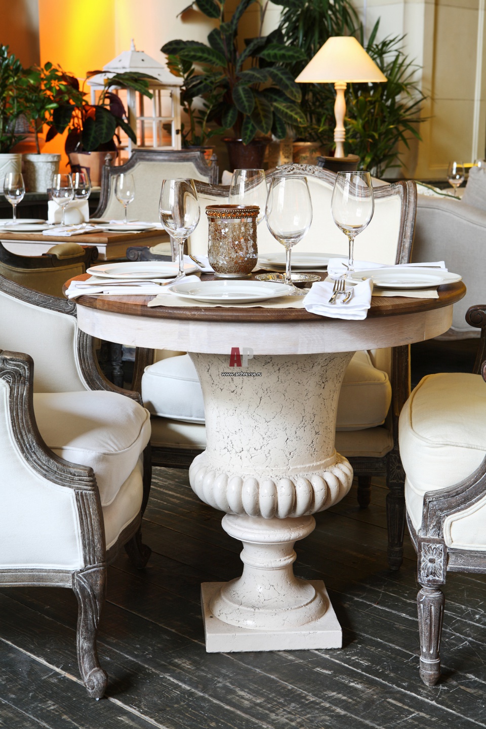 Подножье столов центральной посадочной линии выполнено в форме французской садовой скульптуры из камня.