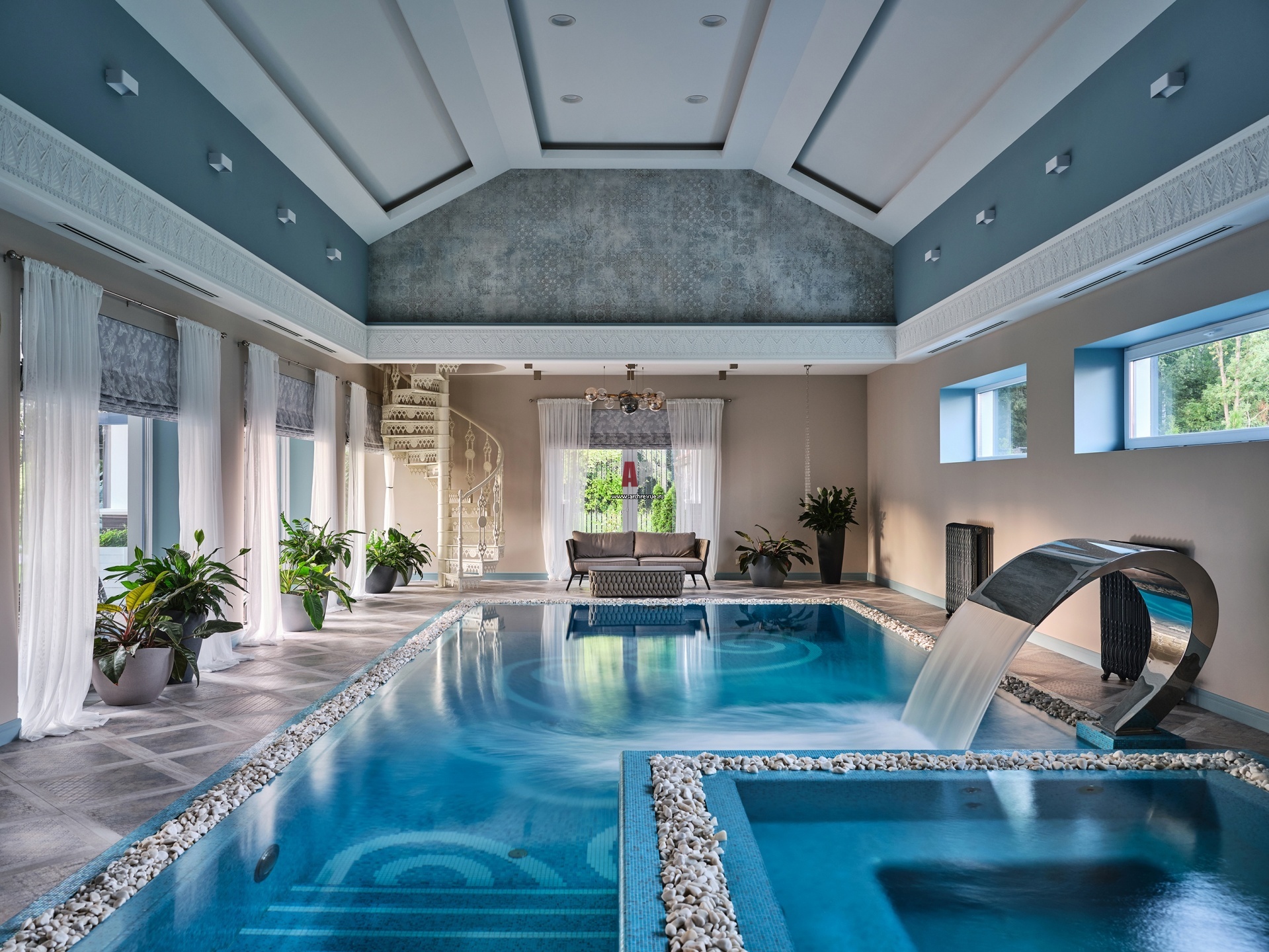 В СПА-комплекс можно попасть как из дома, так и с улицы. Панорамные окна бассейна полностью открываются, и позволяют наслаждаться теплом и свежим воздухом. Интерьер бассейна выполнен в современном стиле с классическими элементами. Использованы гипсовая лепнина с гидрозащитной обработкой, настенные фрески, напольная каменная раскладка в греческом стиле. Плитка, Porcelanosa.