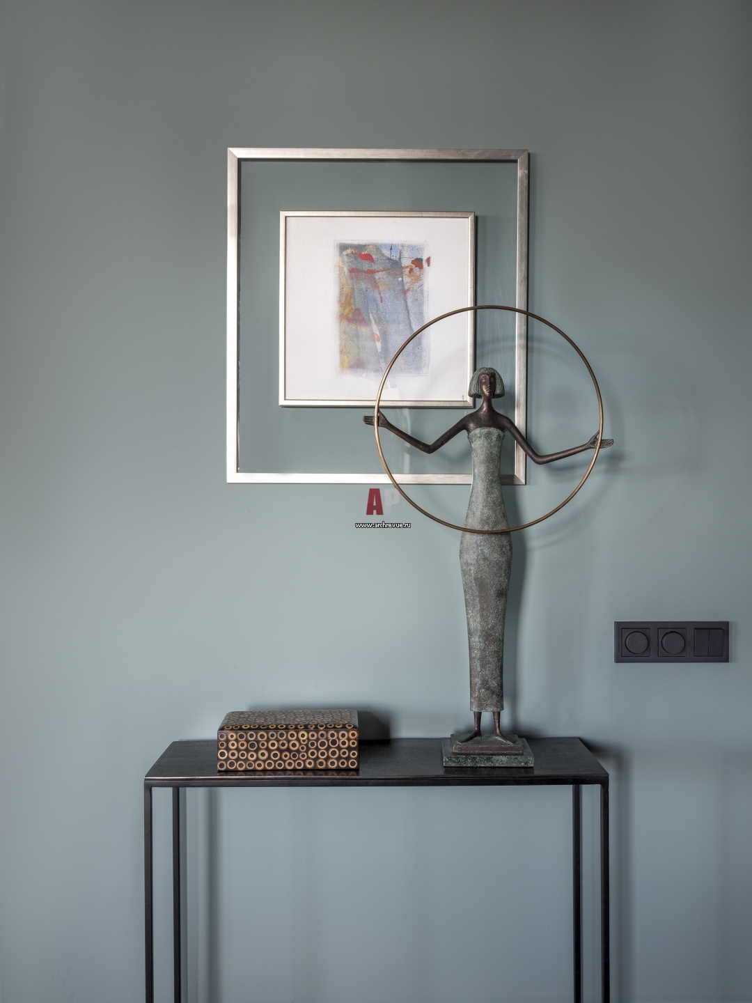 Панорамная квартира с видом на высотку МГУ. Стены квартиры выкрашены в сложный серо-сине-зеленый цвет. Использована матовая однотонная краска, Benjamin Moore.