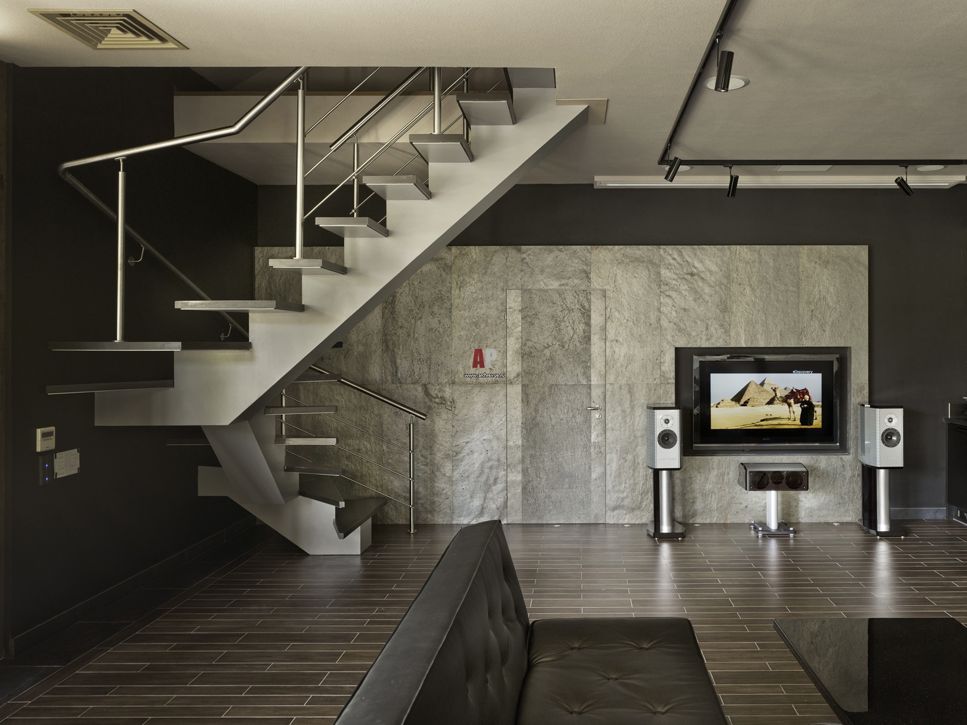 Фото проекта интерьера частного кинозала в современном стиле. Стены и дверь – каменные, из серого сланца.