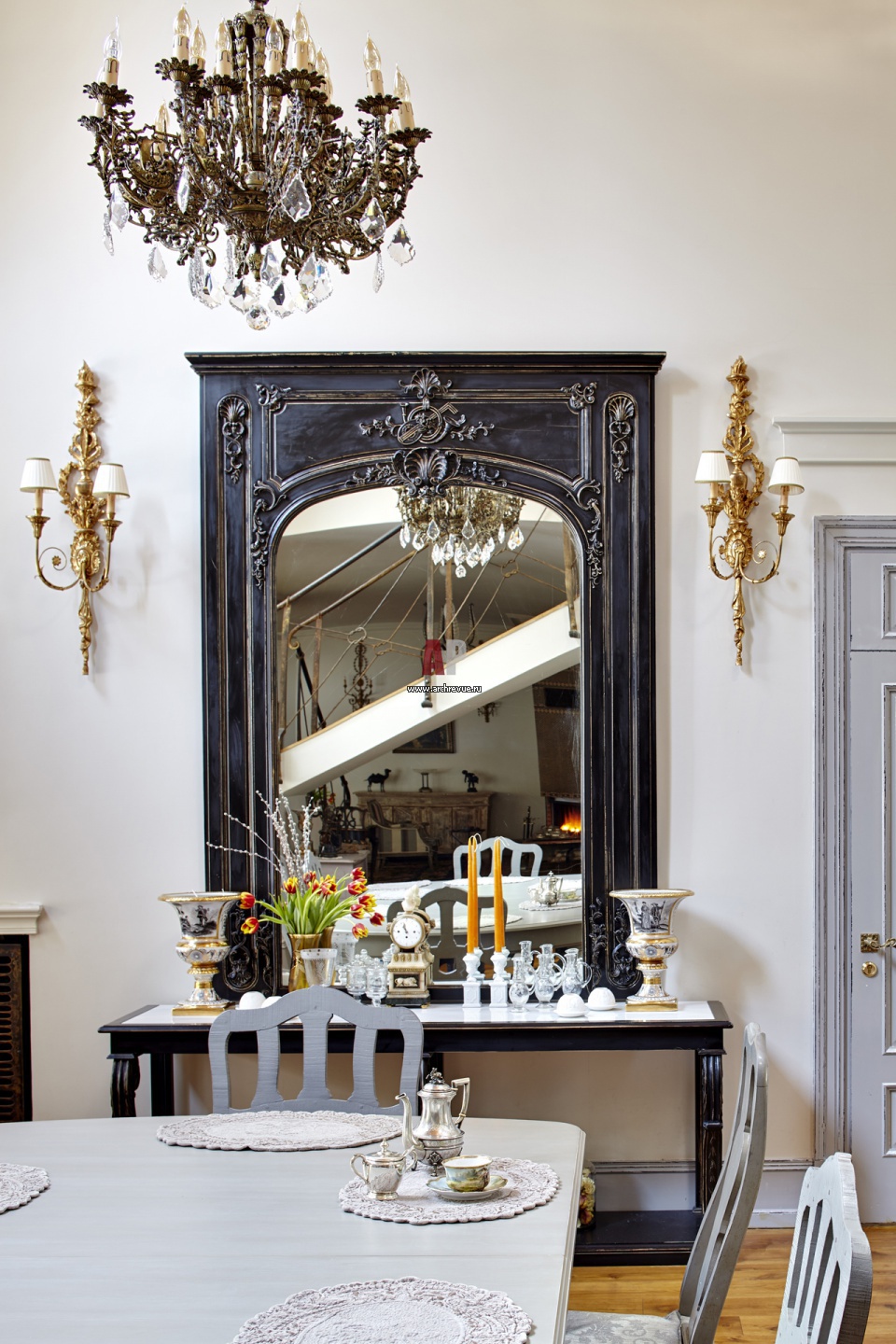 Столовая в неоклассике. Зеркало в состаренной деревянной раме.